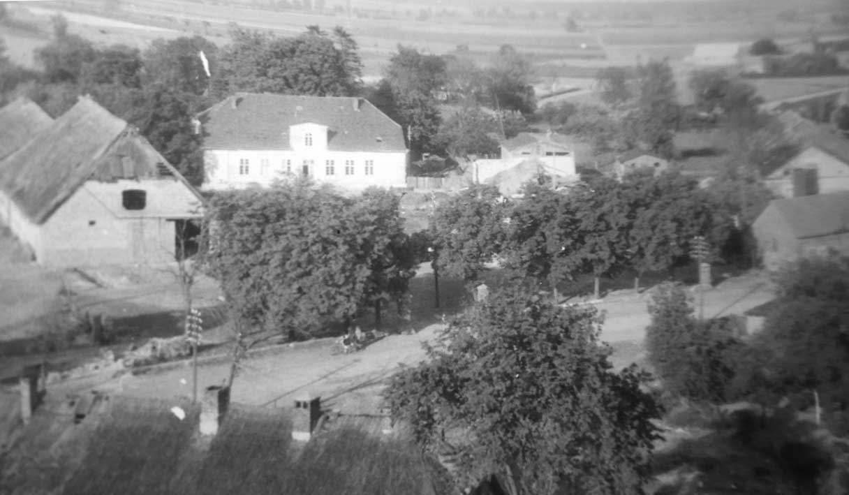 Immerhin, als ich nochmal kam, der Blick vom Turm noch damals10951, zeigte Haus und den Park und den Kuhstall schon eingefallen rechts, die Koppeln rechts hinten und die Sträucher am noch Graben quer und dahinter Koppeln statt Neubauten/Platten und unsere Felder bis zum Horizont