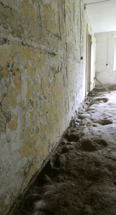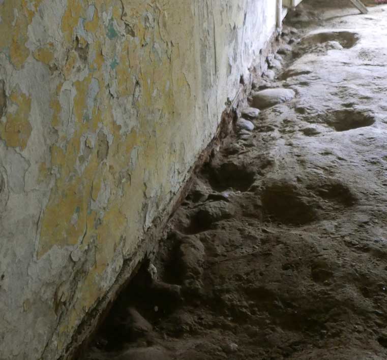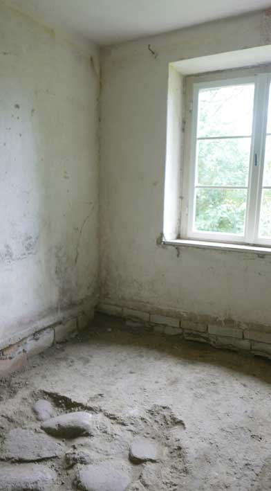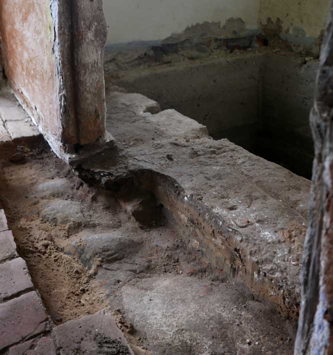 Im Inneren das Haus weiter Keller mit neu freigelegten Schichten unter den Backsteinen noch die Feldsteinebene von davor, wohl als hier noch Tiere ihre Ställe hatten neben den Menschen.