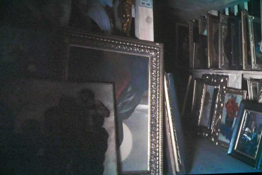 die dort ihre Jause sauf den hölzernen Rückseiten der Bilder einnahmen