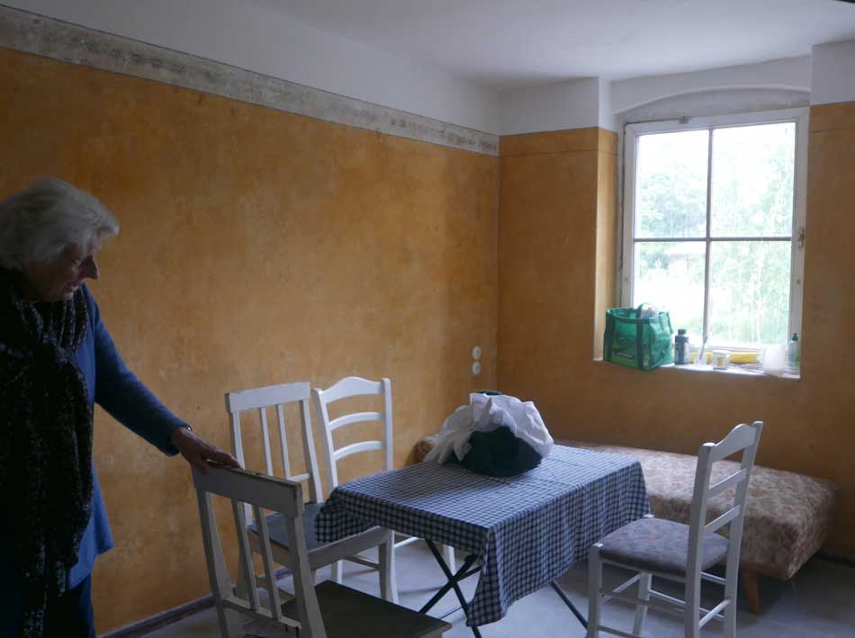 und nun in der Küche von damals mit erneuerten Wänden in alten Farben und Grafitti, auch mit dem wieder gefundenen Oberteil der alten Küchen Kredenz auf dem DDR-Unterbau aus Guben (VEB W.Pieck) nun die Küche neu und wieder.