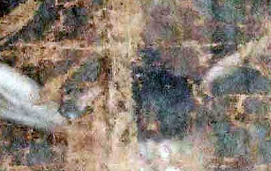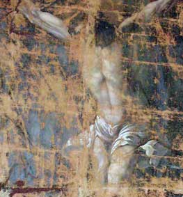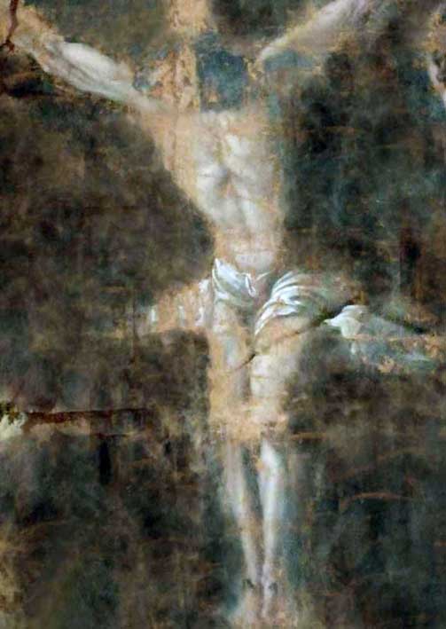 Auch, wie Spuren der Zeit verschieden, nicht der Gegenstande Gewicht oder Bedeutung achtend, sich einmengen. Der böse Schächer rechts neben dem Heiland am Kreuz ist erhalten und an seiner Seite in der Kirche nun dort zuhause.