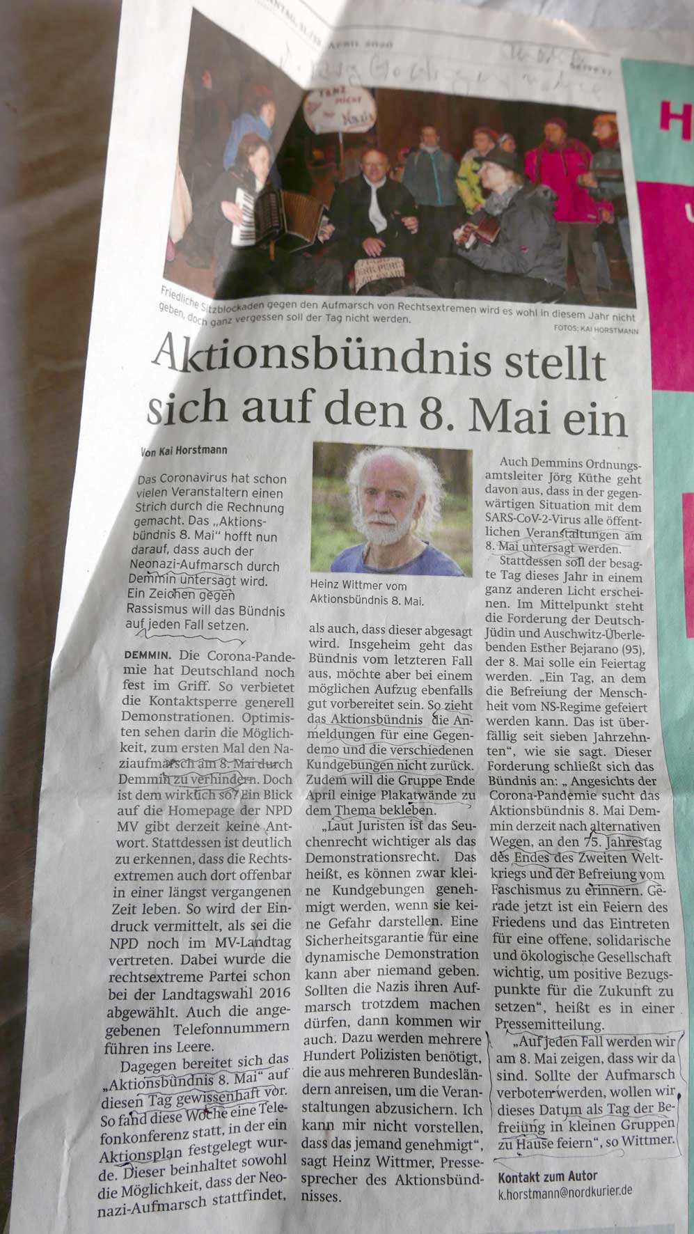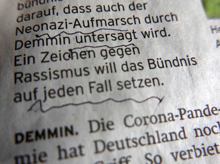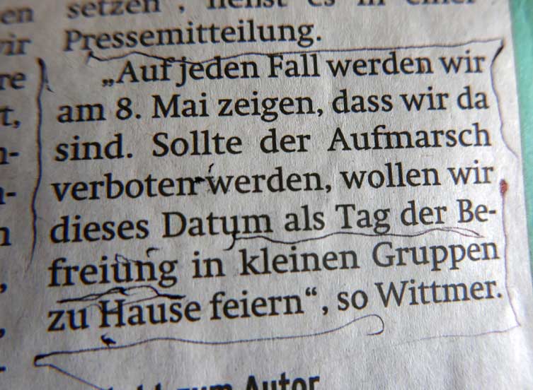 Wir aber wissen, was 45 Mai in Demmin hiess, geschah auf Kosten der Frauen und Kinder der Stadt. Da helfen keine Nägel im Kreuz und fremder Geschäftigkeiten. Allein die Russen sind unsere Nachbarn. Und da ist so manches zu tun. Aber nicht mit Gewalt-Nostalgien der ewig Gestrigen und ihrer einträglichen Rituale. Lasst uns die Stadt wieder aufbauen und die Strassen nach den wahren Helden benennen, die für ihren Mut in die Straf-Lager gingen und aufschrieben was war, und die heissen Solschenyzin und Kopelev als sie die Form fanden für die wahre Befreiung aus dem falschen Sieg solcher Feiern bis heute, dass die Geister des Fluchs uns nicht verlassen.