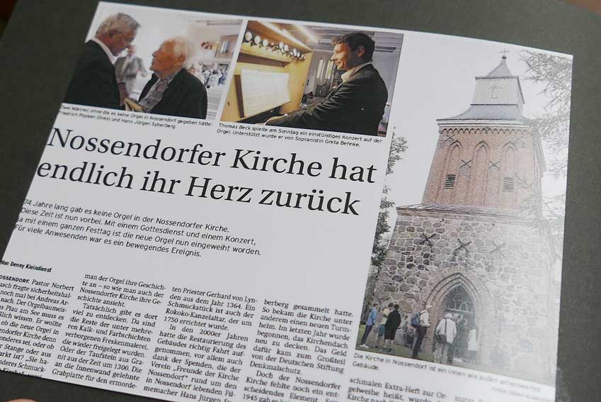 Inzwischen war endlich eine passenden Orgel aus der Werkstatt Buchholz des 19. Jahrhunderts gefunden und die viel aufwendigere Restaurierung mit Transport und von ihm aufgestockten Beträgen gesichert. Dass die Orgel nun eingeweiht werden konnte