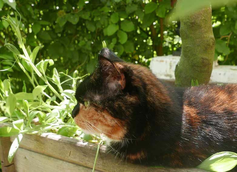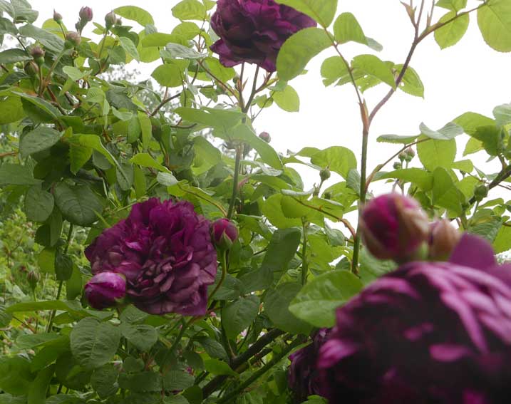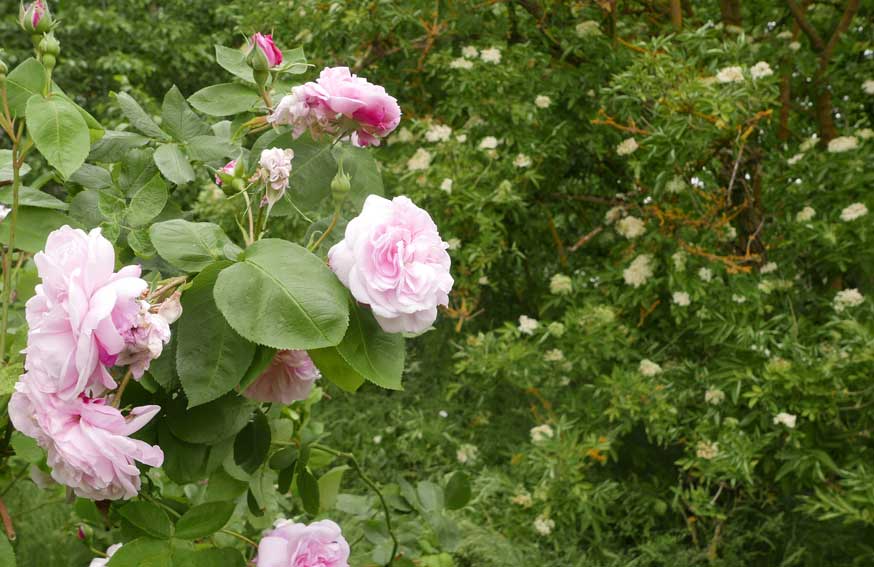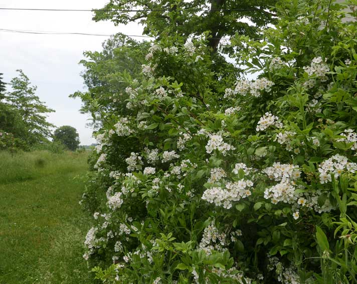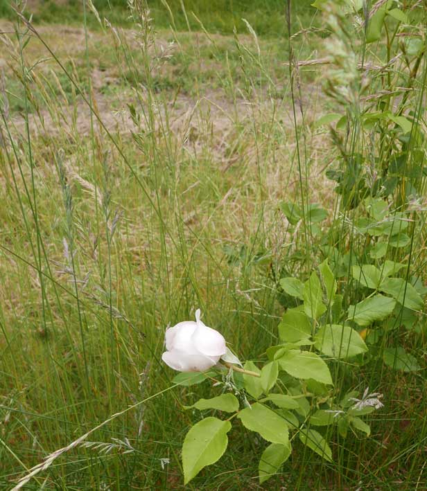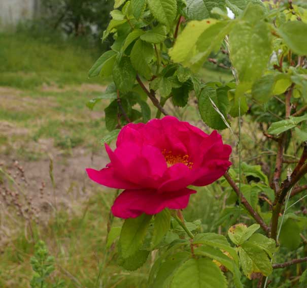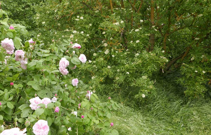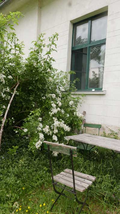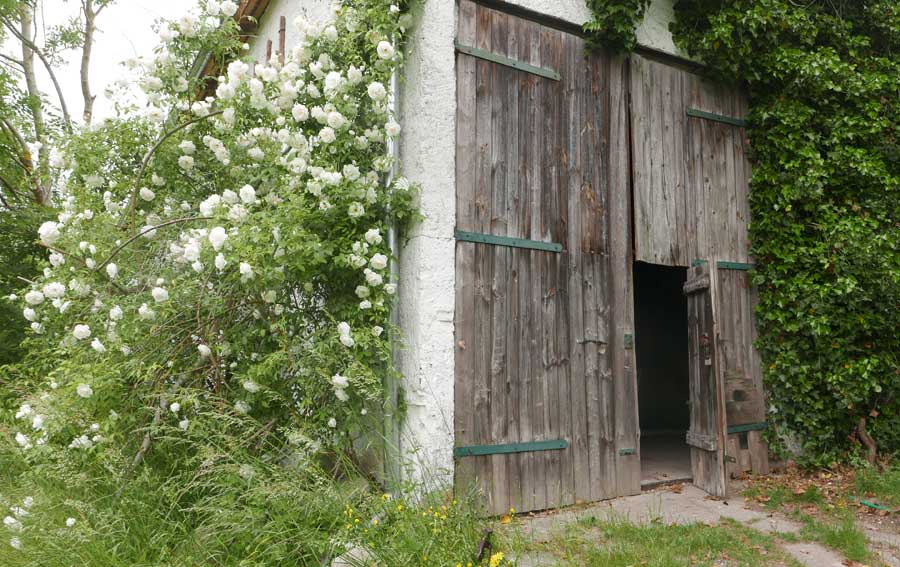die vorher eine Scheune war, mit demselben Tor. Nun zwischen Gaisblatt (ewig seit Rubens G-Laube, in Mü.)und Rosen("Schneewittchen, sehr robust und dankbar".