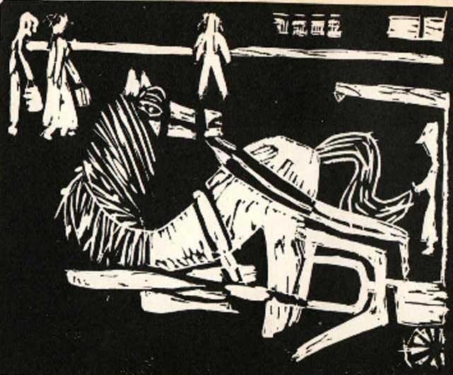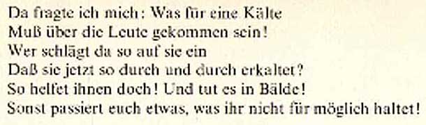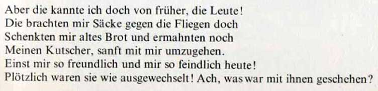 zusammenkommend die Brüder Grimm der Märchen, der Brecht in Not, Schleef dessen tapfere Tochter es zugeschickt und weiss warum am Preussen-Tage gestern nach Stolpe nun und für Nosssendorf denn uns in Demmin. Das schweigende des leeren Markts noch immer: dies gemordete Nietzsche-Pferd der Kinderzeichnungen dazu.
