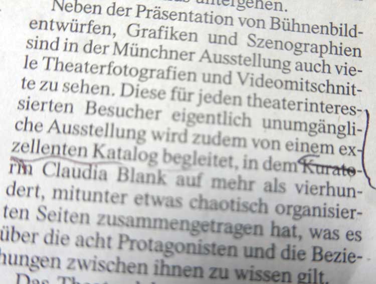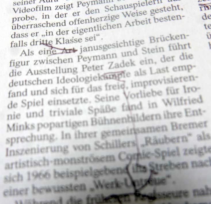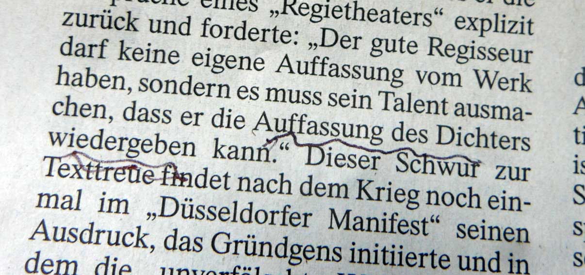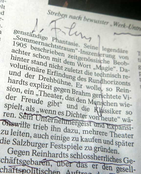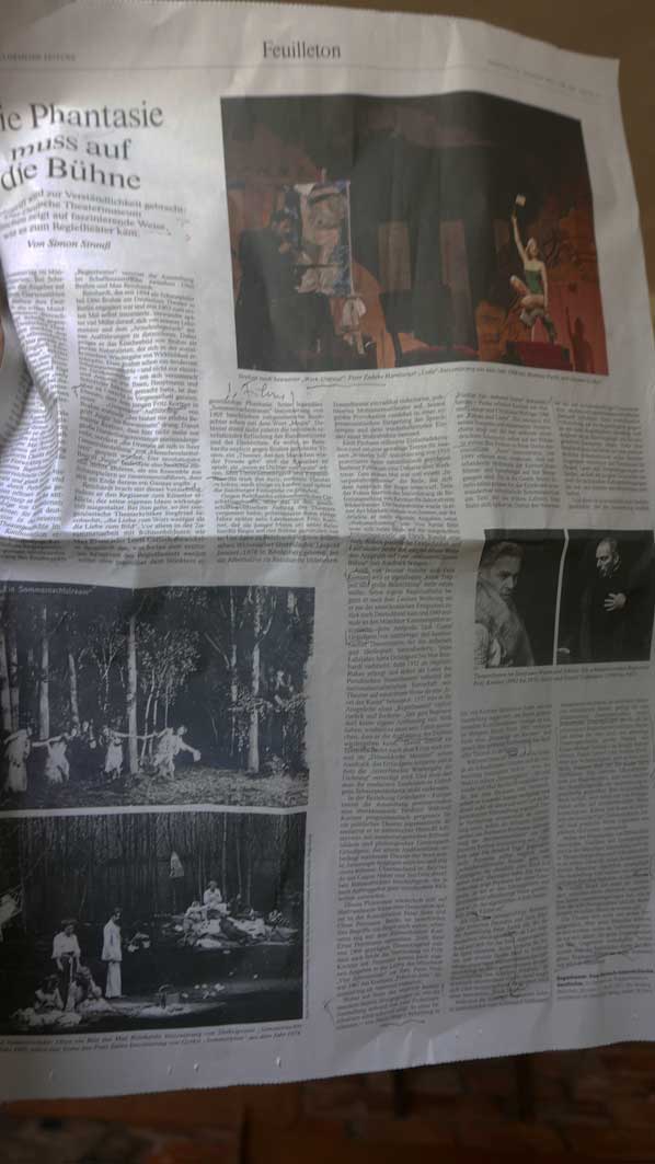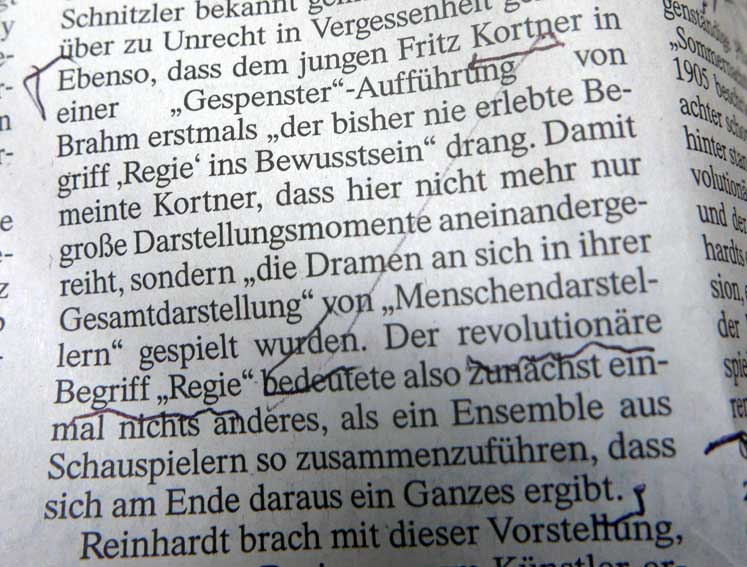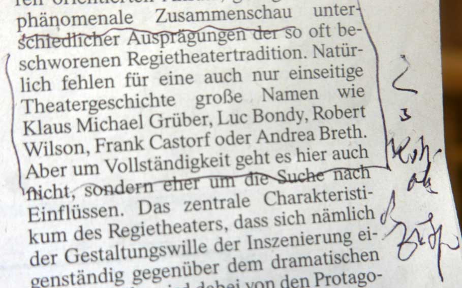 Peymann sagte nein in Wien der Burg, wo kommen wir da hin, das ist überhaupt untersagt, Schitthelm von der Schaubühnen in Berlin sagte, dann könnten wir ja zumachen, und der meinte dan ganzen Betrieb. Wir wiusst, as hatte etwas von Schwanengesang des Abschieds, den die anderen vielleicht nicht wagten. Grüber staunte in Paris nach der ersten Probe dort, was wir immer gewollt, sie sagte warum habt ihrs nicht getan. Ich selbst hatte das Wort Regie abgelegt für das was da gescah. Hier nun manchmal erscheint es so, als wäre das alte Wort Regie verwendbar, als alter Zeit an diesem Ort, wie gesät wurde und geerntet und eingeteilt und dem Wetter abzulauschen war was wann und wie oder wer.