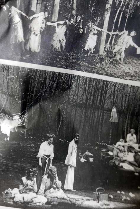 Auf der Suche nach dem Regisseur der dort einladenden und erstaunlichen Bühnendekoration, finden wir versteckt und klein hinten, dass es eine Montage des Designs ist aus 2 in einandergeschobenen Bühnenbildern, die so auf der Bühn nie zusammen existierten