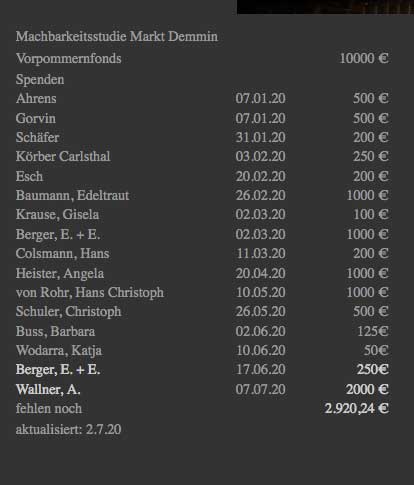 Der aktuelle Spendenstand für die Machbarkeitsstudien am Markt in Demmin und noch immer fehlen 3000 Euro vor dem Toresschluss. Aus Demmin nichts. Und doch ... Auch wär es da gewesen aber zu Bedingungen das Unheil der Stadt zu besiegeln. Mit unserem Namen.