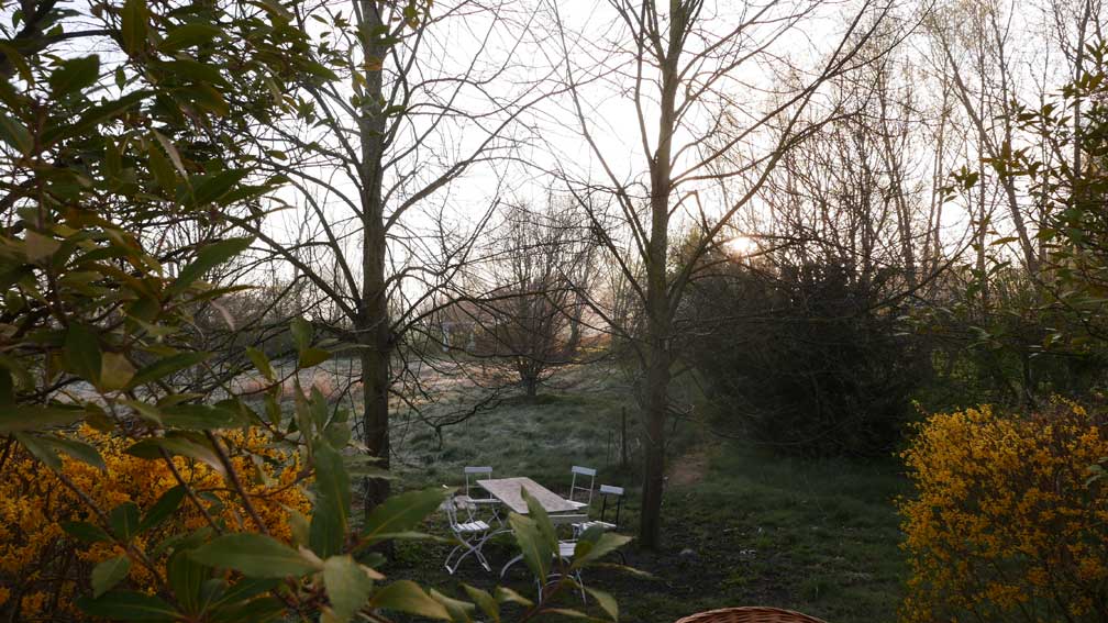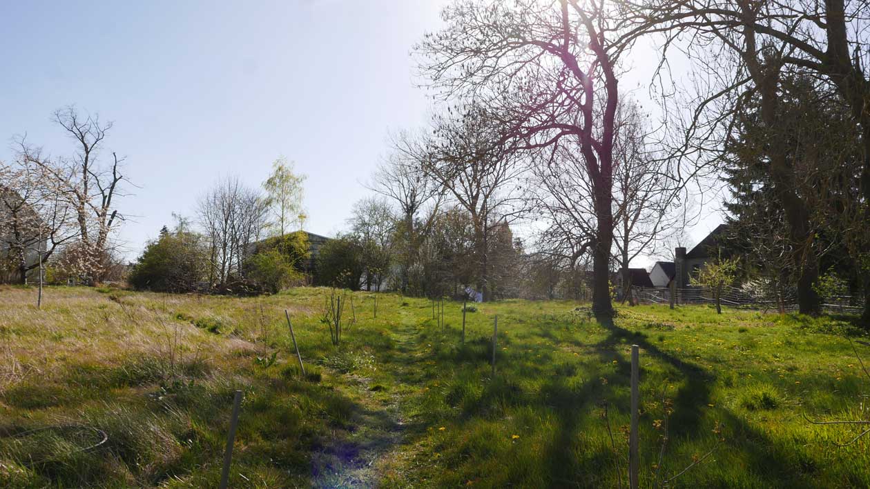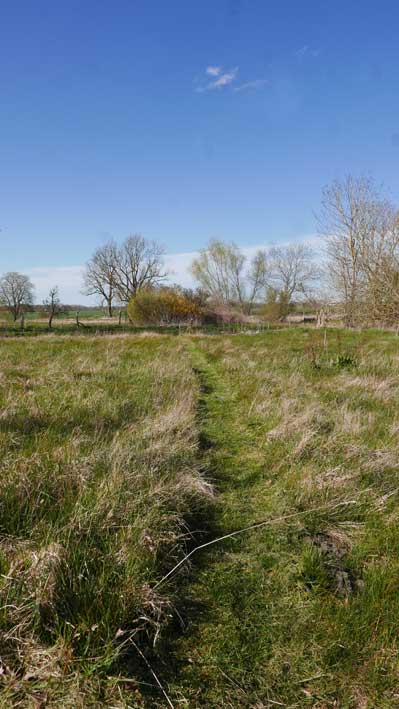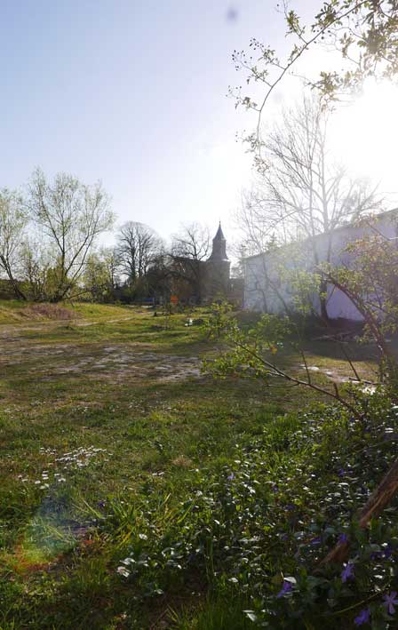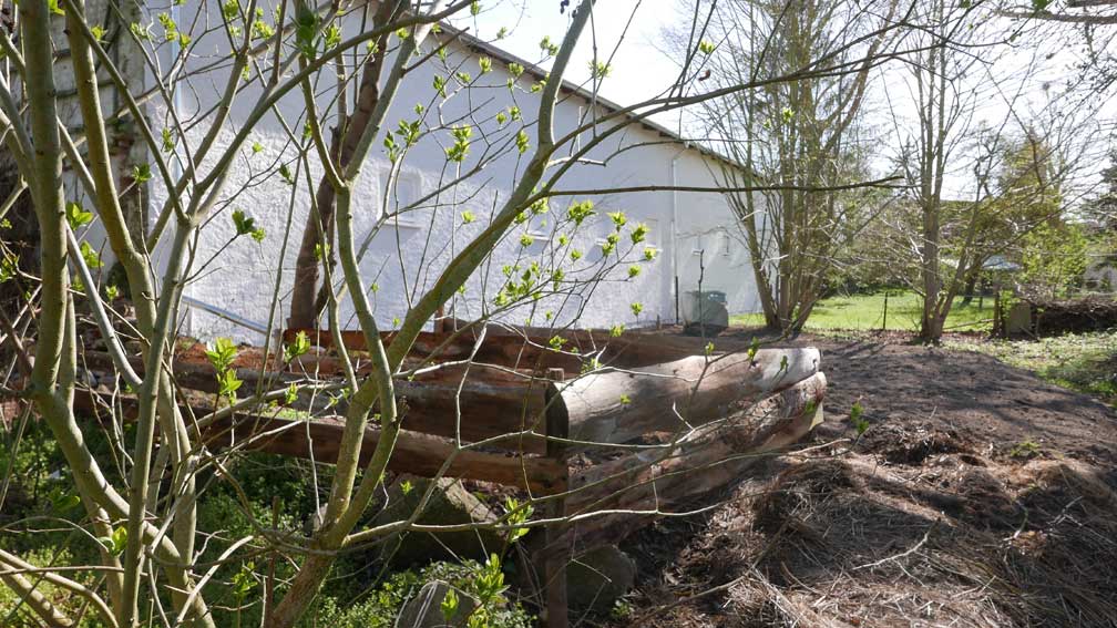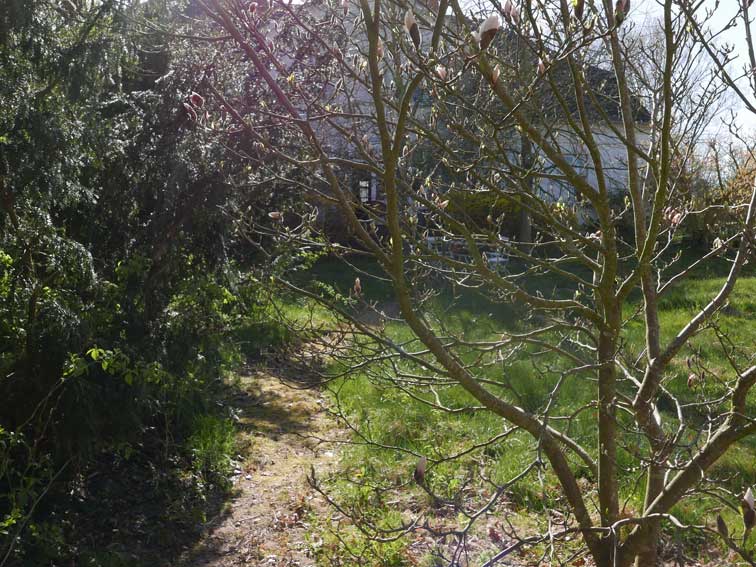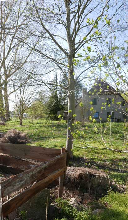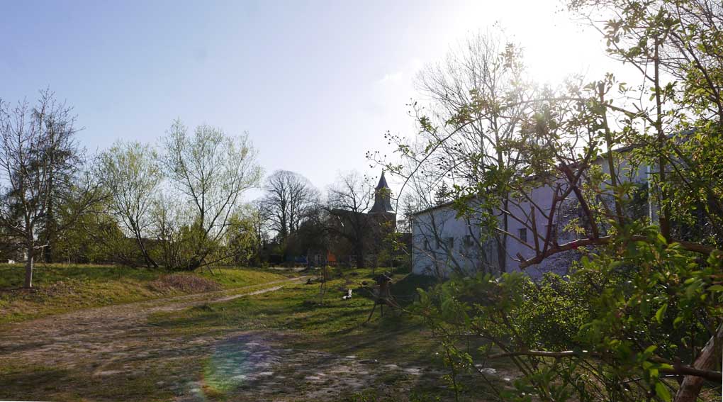 man beachte die Linde links wieder mit Knospen u d die Birke mit nuem Gründ in der Mitte. Die Pfade führen zu Haus und Hallen/Scheune mit Turm dahinter.
