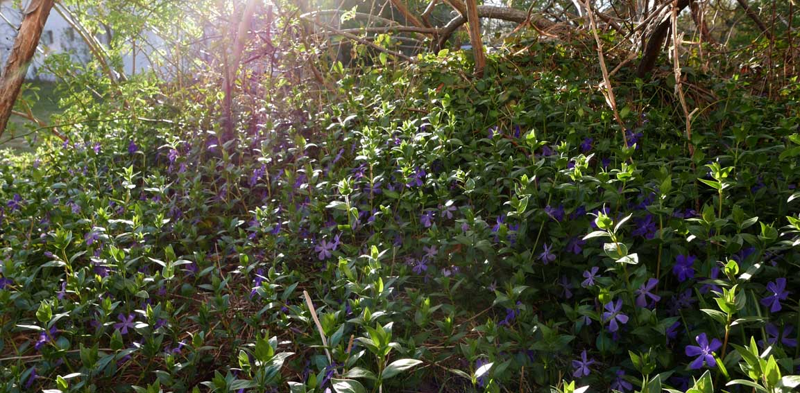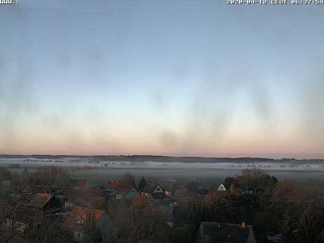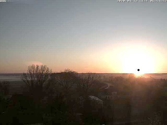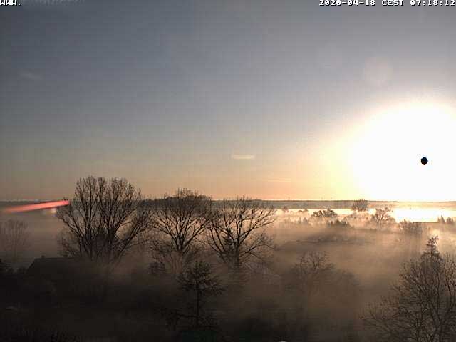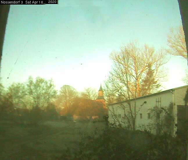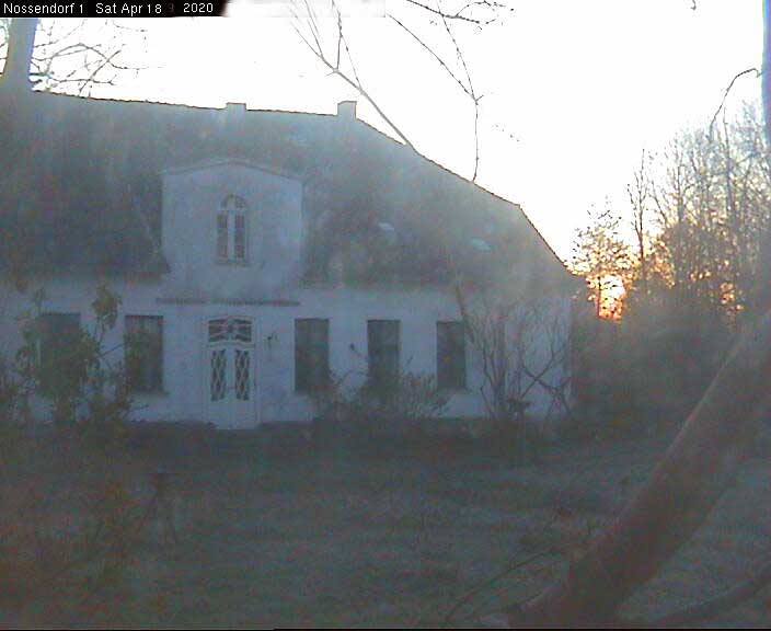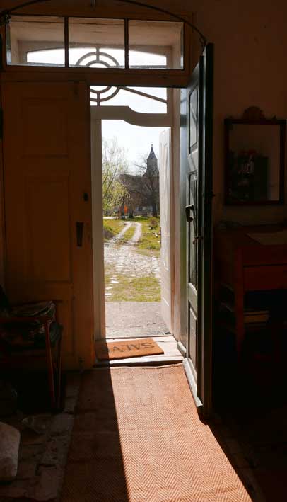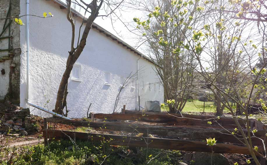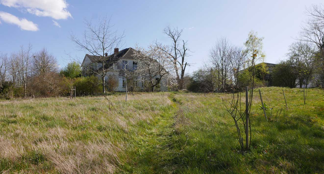 man beachte die Linde links wieder mit Knospen u d die Birke mit nuem Gründ in der Mitte. Die Pfade führen zu Haus und Hallen/Scheune mit Turm dahinter.