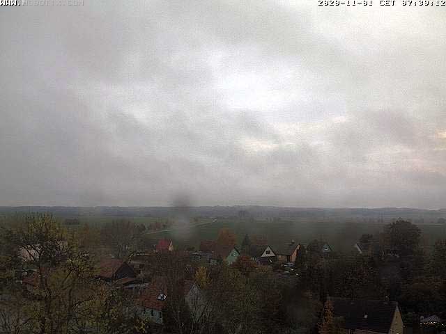 A-Hauses neuen Anbau wieder leuchten, dass das Ensemble der Hoflage nochmal erkennbar wird. Vom Kirchturm gesehen. Weit bis zur Trebel hinten.