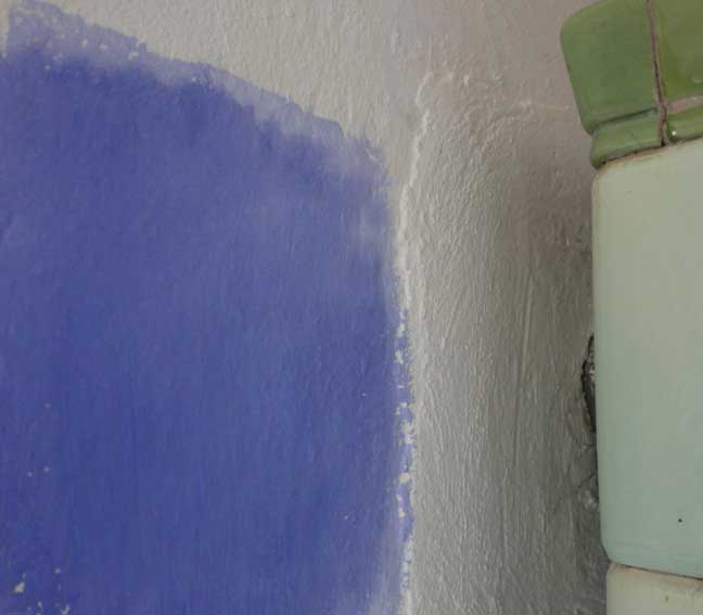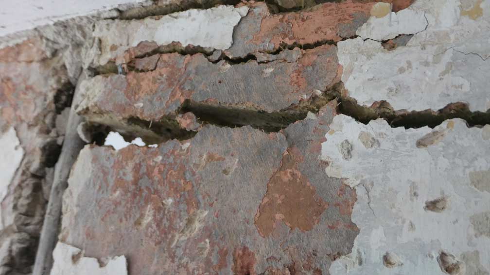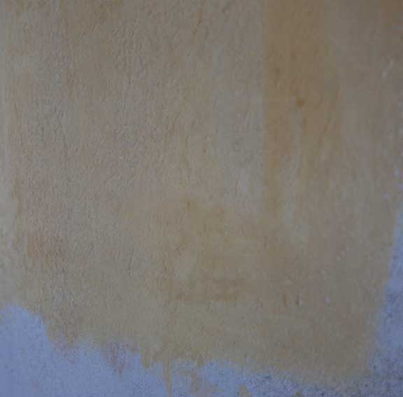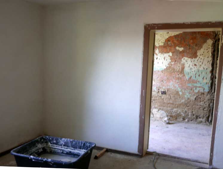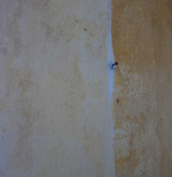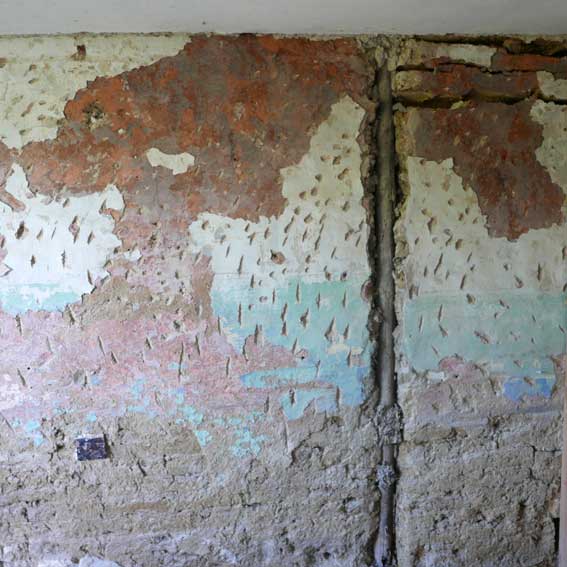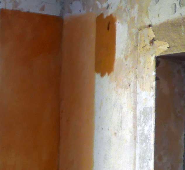 die alte Wand auf dem Gang, Achses des Hauses, freigelegt, von den Zementschichte ihrer Hülle befreit