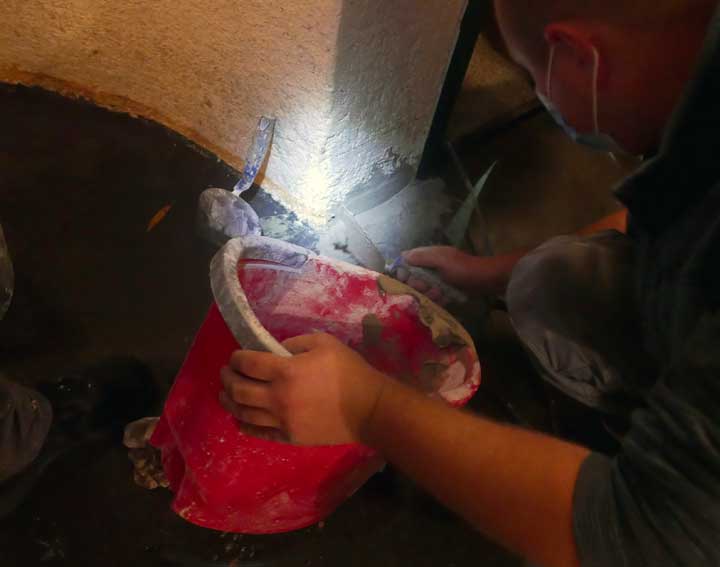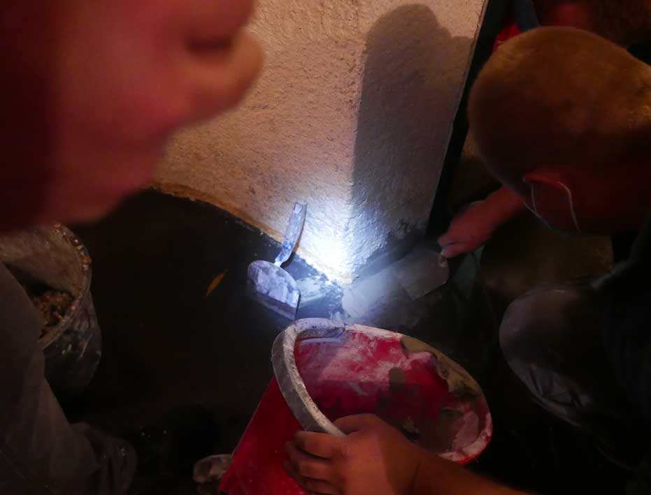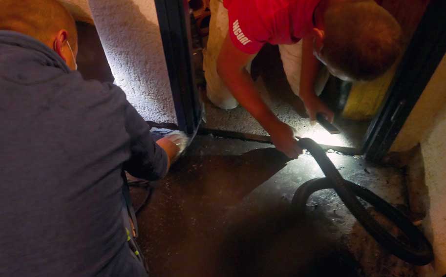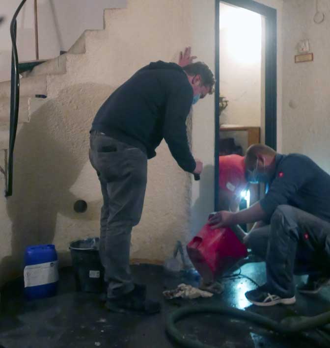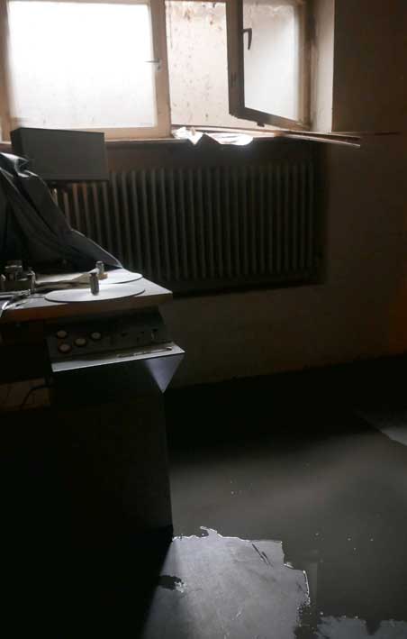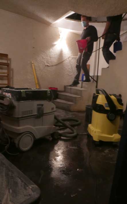 Wortlos, nur zu Griffen der Ton. Am Ende wir kriegen das in den Griff. In der Nacht wieder 8 Eimer Wasser, absaugen. Montag weiter.