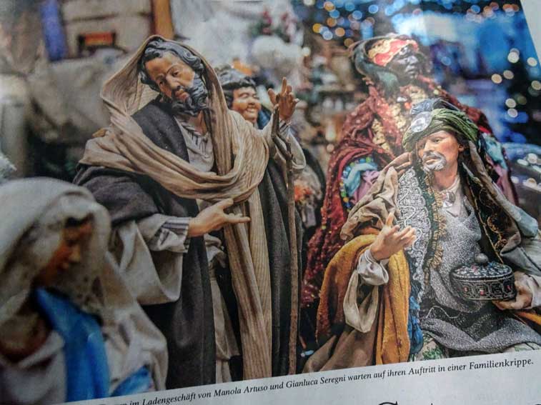 E.Blume unser Freund schickte Puppenals Bilder in der Weihnachtskrippe, die er aus Italien mitbrachte. In der Zeitung erfahren wir was sie dort bedeuten, oft mit den Gesichtern der Besteller. Auf den Strassen und in den Hütten des Geschehens nun.