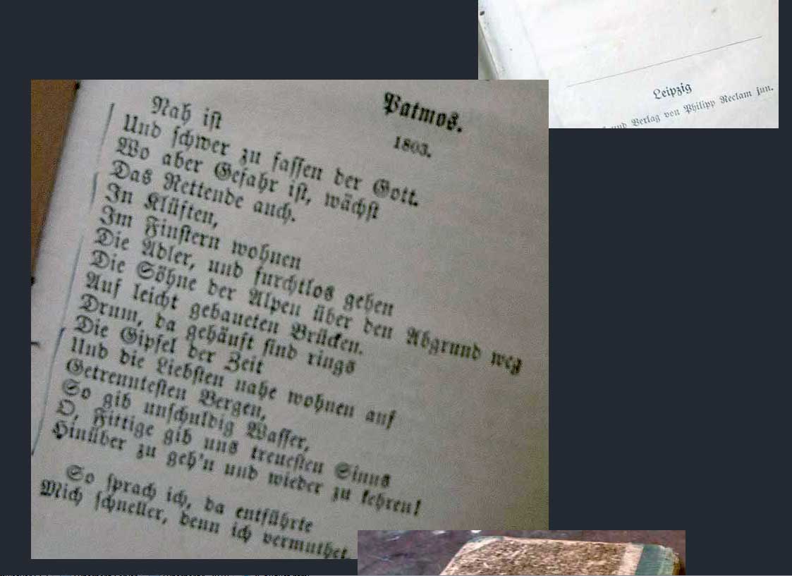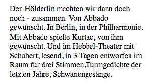 Wenn sie jetzt in grosser Anzahl der Darstellungen des Hölderlin in Filmen und auf dem Theater gedenken und ganze Hekatomeben anverdienstvollen Namen fallen, so ist es immer als ob man das nachstellen könne, was da gewesen, gedacht oder als Leben war. Wenn F.Gulda zu der jungen M. Argerich sagen konnte, auf ihr sie verstehe den Schubert nicht, sie könne ja nichts dafür, dass sie in B. Aires geboren sei, so wird man das hier so nicht übertragen können. Es sei denn die Heutigen hier seien soweit entfernt, dem Hölderlin, wie B.Aires dem Schubert.