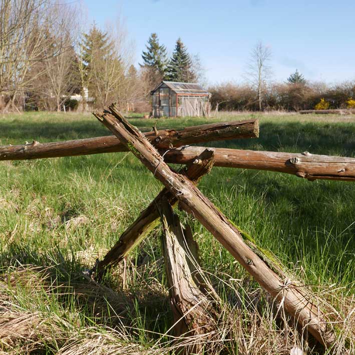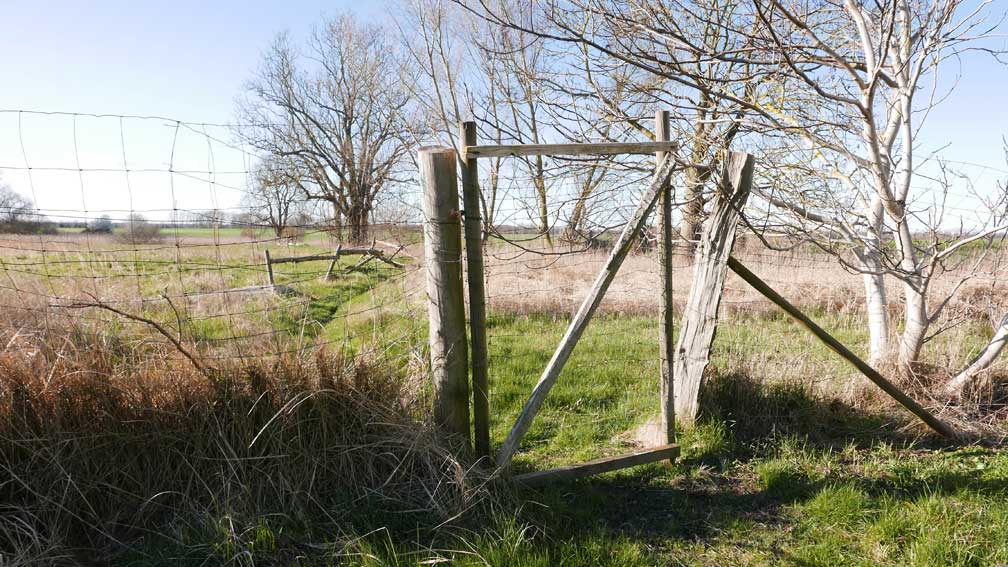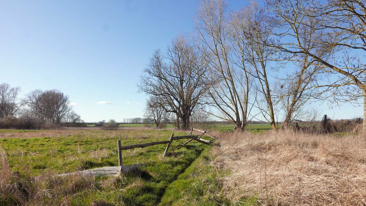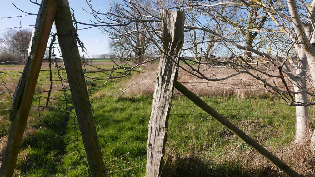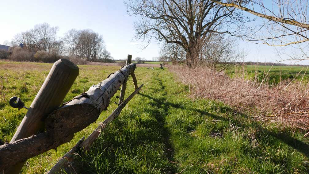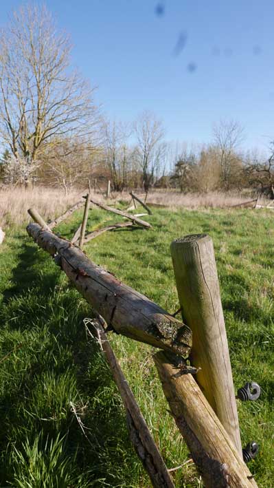 Der Zaun für die Schafe im nachwinterlichen Zustand mit dem Pfad für sie Tiere draussen entlnag