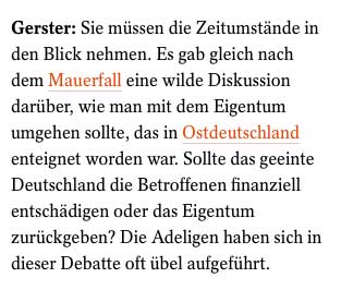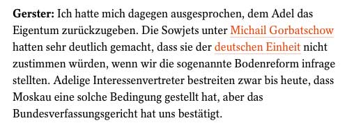 wie das System -aus dem aktionellen SPIEGEL-Online- zur Rückgabe in der Hohenzollern-Frage sich schon damals selbst belog, indem sie Gorbatschow als Zeugen für die Notwenigkeit der Beibehaltung des DDR-Rechts aus einem Bundesgerichshof - Urteil holte, so ist es unwahr, eine "Unwürdigkeits"- Klausel wegen Naziverstrickung zum Anlass zu nehmen für eine Gesamt-Strafe aller Enteignungen von Grund und Boden auf dem Lande. Mit Ankaufsverboten bei teilweise wiedererworbenen Landes in der Nähe der alten Ländereien am neuen Wohnort. Und Lüge wenn sie so tun als sei das ihre Erfindung.