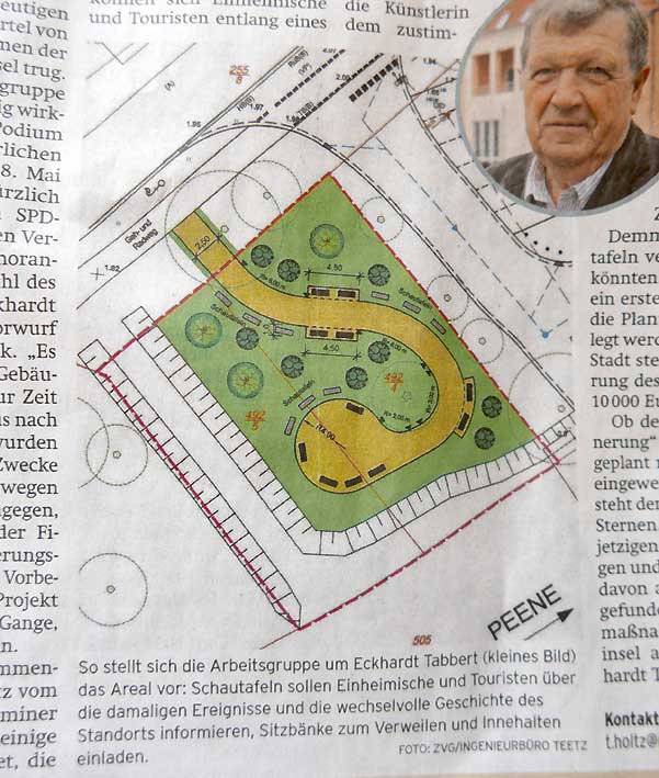 Was sehen wir vorgezeichnet. Am historischen Ort, auf vorgegeben Gelände des Ufers am Fluss. Eine Möglichkeit zu sitzen und zu stehen. Und zu lesen oder zu sehen, was da an hochgehaltenen Schaukästen, welcher Form, gezeigt wird. Von wem, wessen Inhalts. Für wen. Für wen nicht... Angeboten 75 Jahre vor dem Jahrestag des Geschehens. Aber über allem etwas Geheimnis muss bleiben. Wird zu bedenken sein. Des grossen Warum. Und Wofür. Gebete? es geht um die Toten der Stadt.