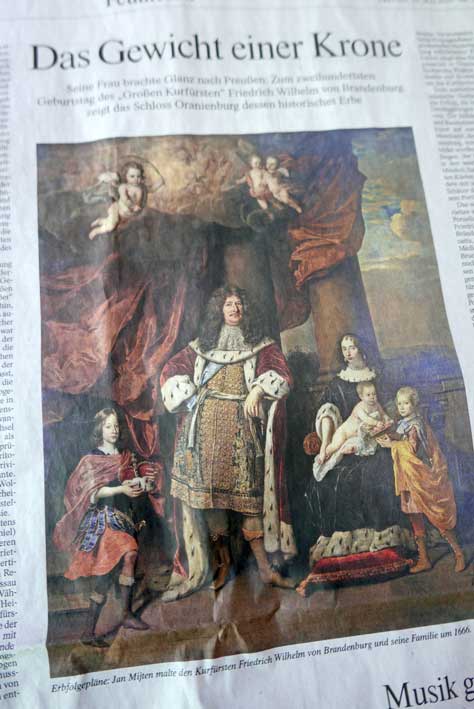 In Berlin eine Ausstellung zur Zeit zu Leben und Bedeutung des Grossen Kurfürsten als ersten König von Preussen. Nicht im neuentstanden Schloss als Zentrum der Stadt. Eine Stadt und ein Preussen, die sich schämen. Dessen Frau, wie wir lesen, brachte die Kultur, wovon Berlin heute existiert. Kultur aus Holland, Schweden, Polen, Frankreich, England und Italien.