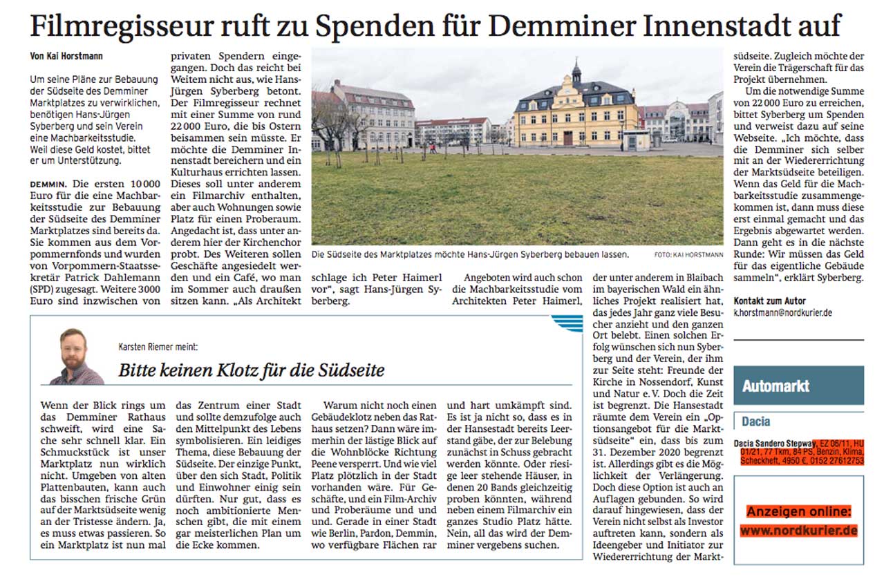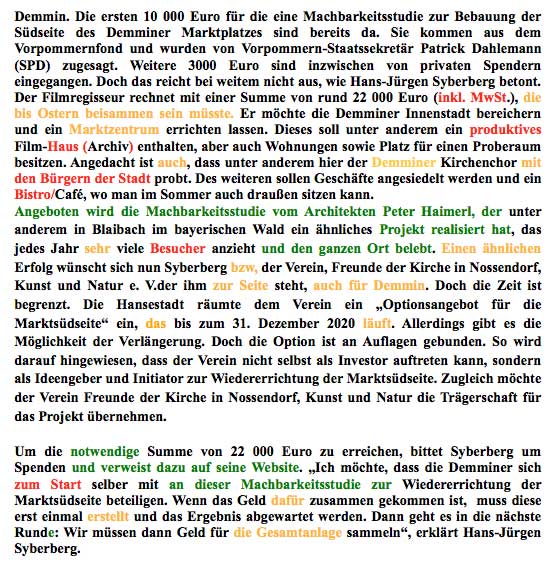 Angeboten wird die Machbarkeitsstudie vom Architekten Peter Haimerl, der unter anderem in Blaibach im bayerischen Wald ein ähnliches Projekt realisiert hat, das jedes Jahr sehr viele Besucher anzieht und den ganzen Ort belebt. Einen ähnlichen Erfolg wünscht sich nun Syberberg bzw, der Verein, Freunde der Kirche in Nossendorf, Kunst und Natur e. V.der ihm zur Seite steht, auch für Demmin,. Doch die Zeit ist begrenzt. Die Hansestadt räumte dem Verein ein „Optionsangebot für die Marktsüdseite“ ein, das bis zum 31. Dezember 2020 läuft. Allerdings gibt es die Möglichkeit der Verlängerung. Doch die Option ist an Auflagen gebunden. So wird darauf hingewiesen, dass der Verein nicht selbst als Investor auftreten kann, sondern als Ideengeber und Initiator zur Wiedererrichtung der Marktsüdseite. Zugleich möchte der Verein Freunde der Kirche in Nossendorf, Kunst und Natur die Trägerschaft für das Projekt übernehmen.