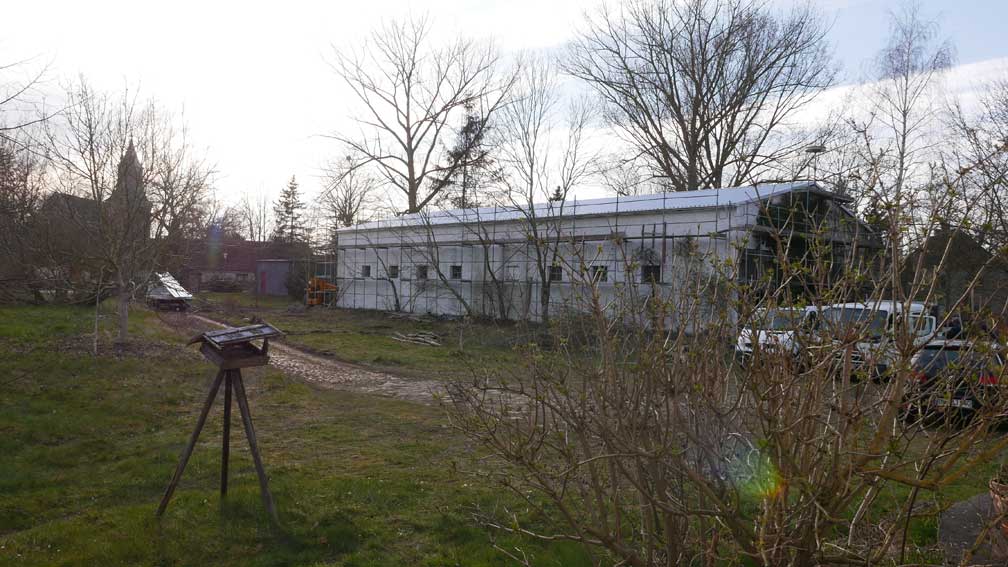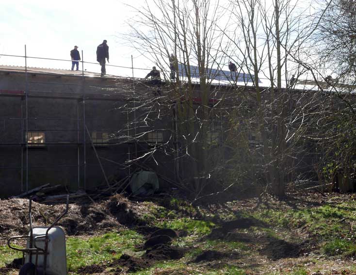 von den 8 oder 10 wer noch da ist, in einer Woche von Montag das Dach. Aus dem Asbest wie neu das Ganze. Die Halle jetzt noch mal von der Scheinen wissend mit Dach aus Schilf.