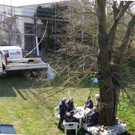 Und dann kommt aus Demmin der Kuchen von Mutter Esch, vom Sohn abgegeben an der Tür, für die hier Arbeitenden auf dem Dach, aus den täglichen Bildern im Internet zuhaus gesehen. Tapfer umsichtig, nach den Regeln, trotzend, dem was die Zeitungen schreiben und das FS zeigt und das Radio uns erzählt. Als sei alles schon tot.