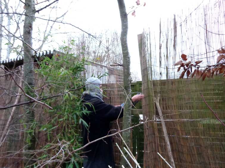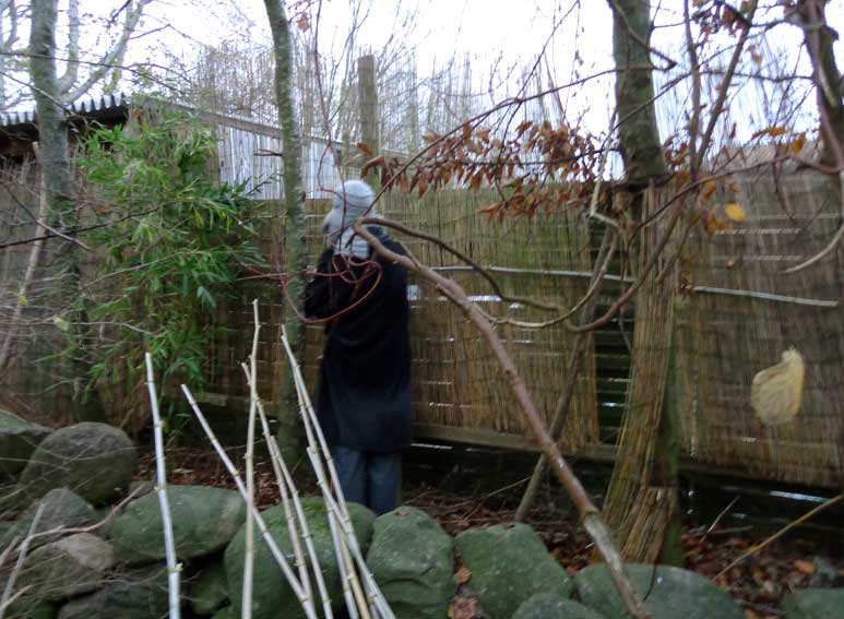 hinter den niederen Steinen das Schilf oben wo es wehtut, alles Laub davor dem Winter geopfert. wenn da nicht wäre jener zarte Bambus, auch gebrochen oben aber dem Auge Hilfe jetzt, die denkt.