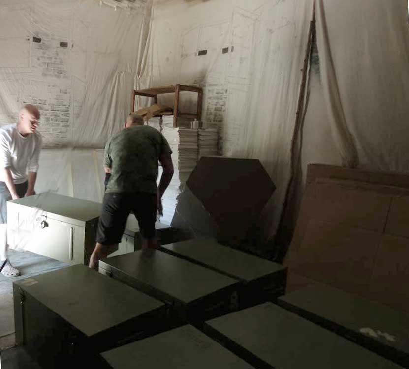 Ein Tag Ruhe in den Kellerräumen. Trocknen, beobachten, ob noch was von aussen kommt. Bergen des Archivs aus München/Berlin.