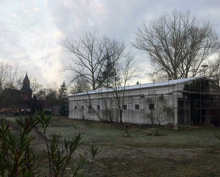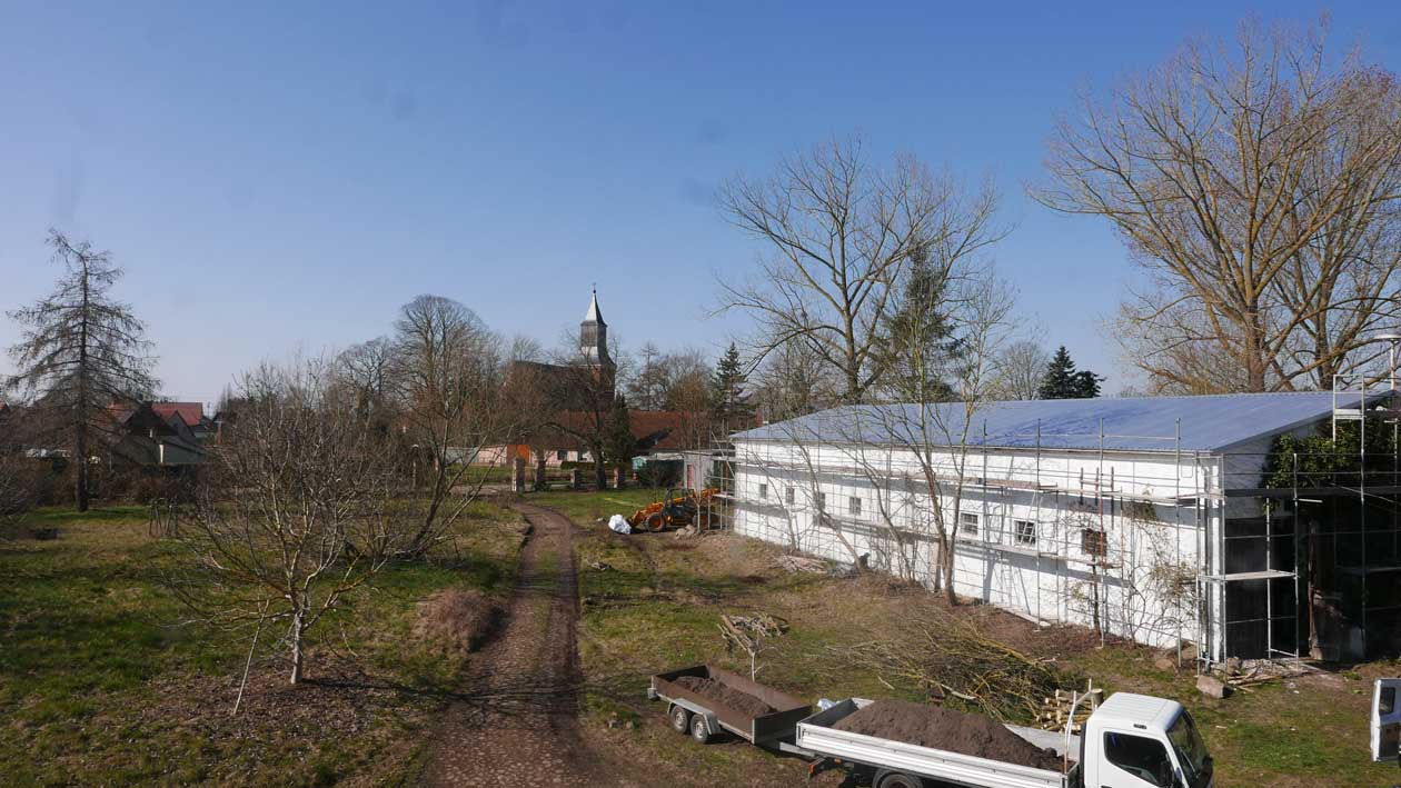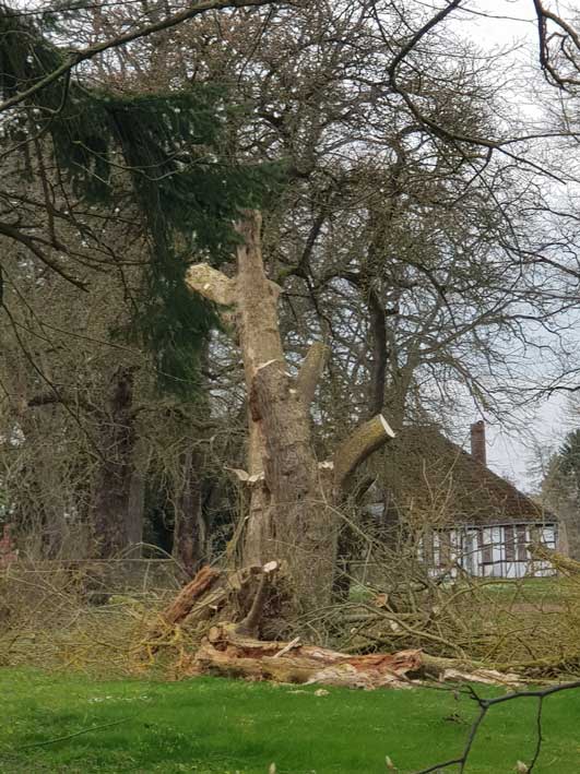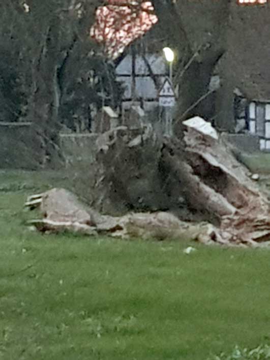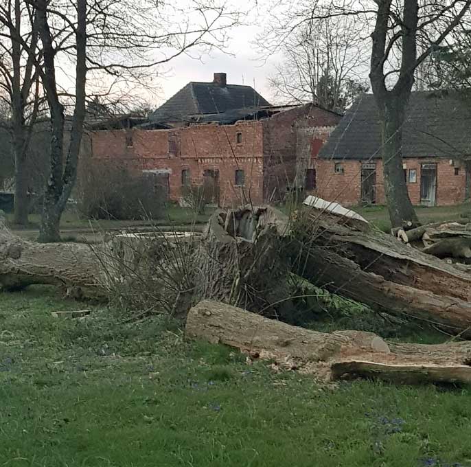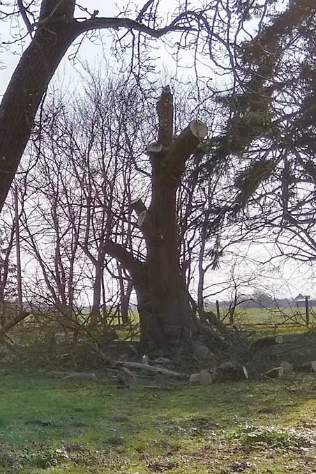 Dieselben Baumschneider berufsmässig wie in Nossendorf auf dem Friedhof. Totalschaden.