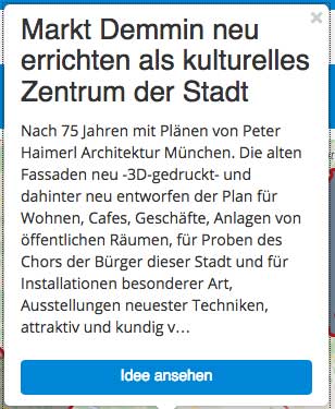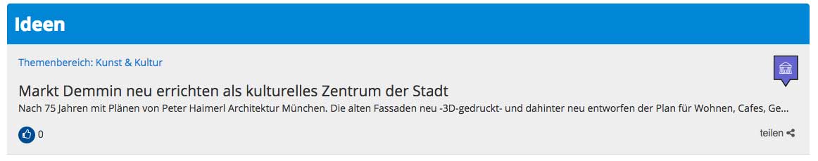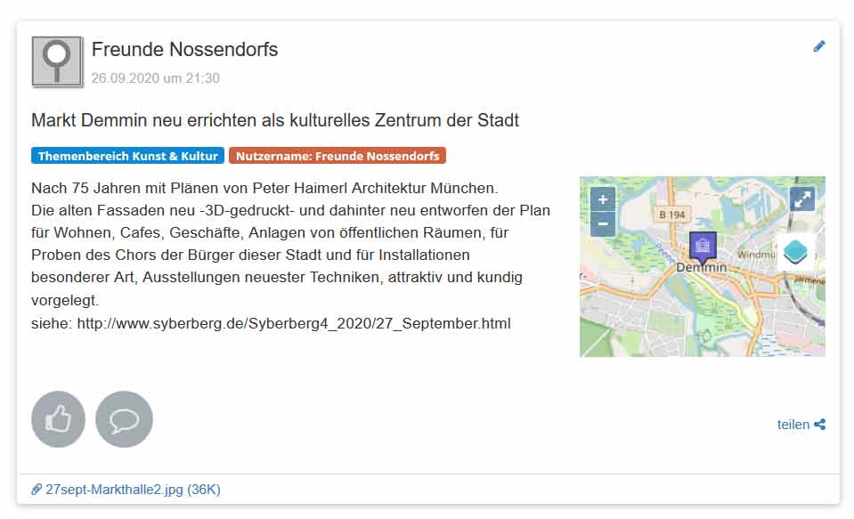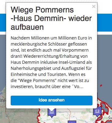 Demmin ist also ein produktiver Ort der Geschichte jüngster Aktivitäten. Von unten her aus privaten und bürgernahen Spenden wie Gedanken und einem geprüften Wissen. Das sollte man stützen. Zu neuen Ufern. Wenn in einer Karte der Ideen gefragt wird nach einem Votum zu sagen was und wo. >>>>