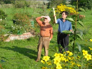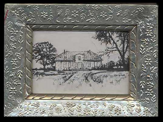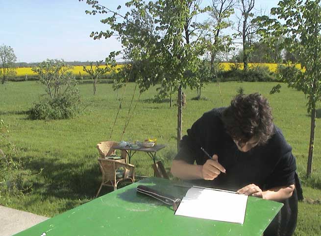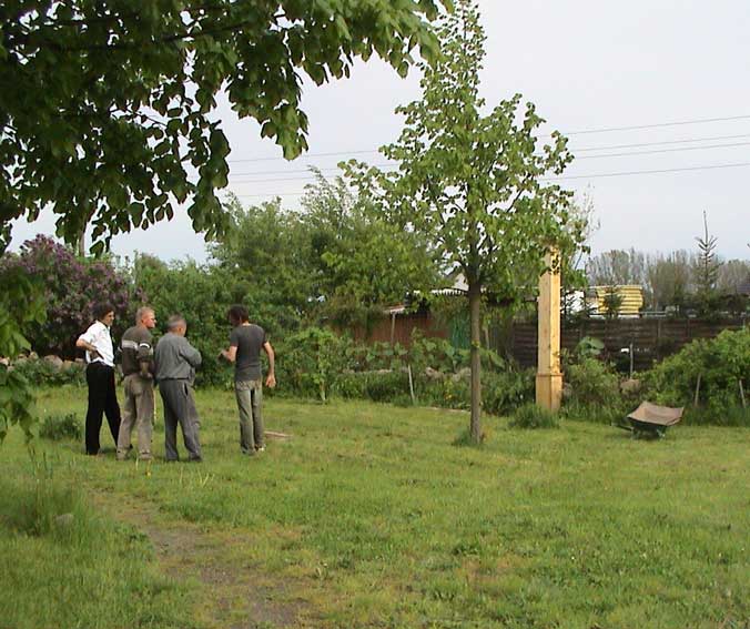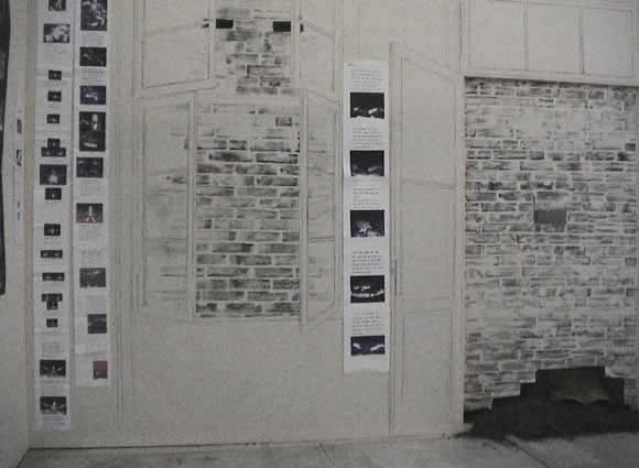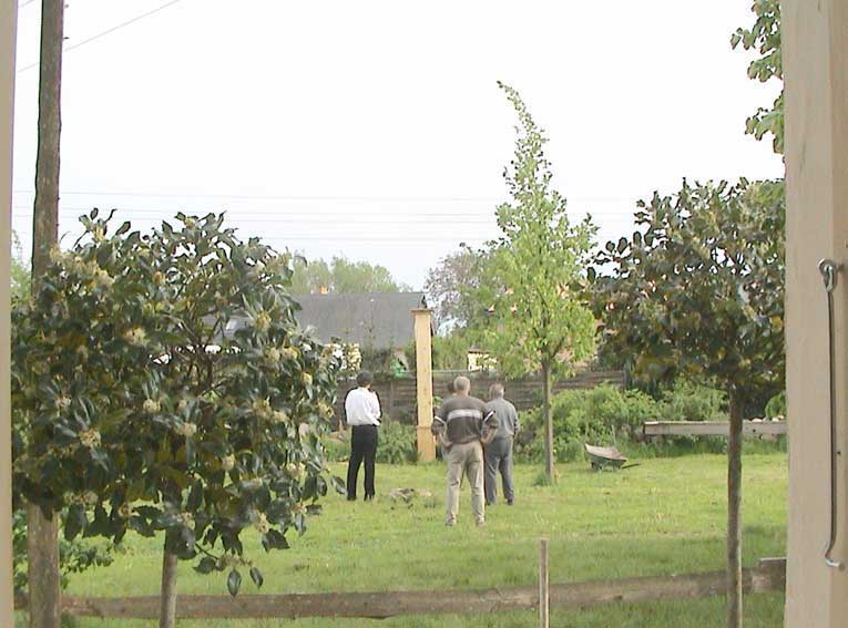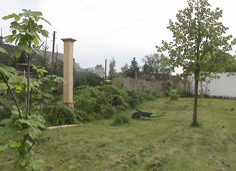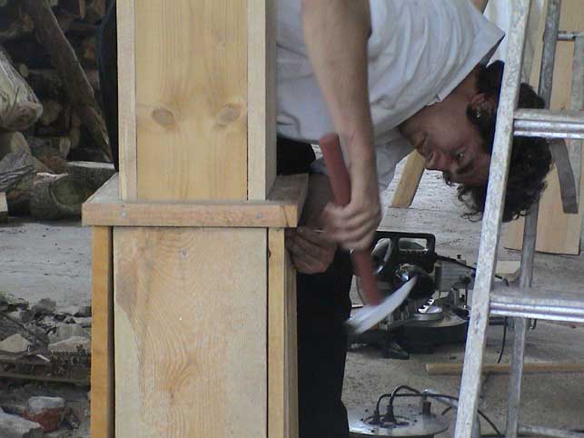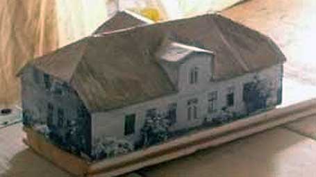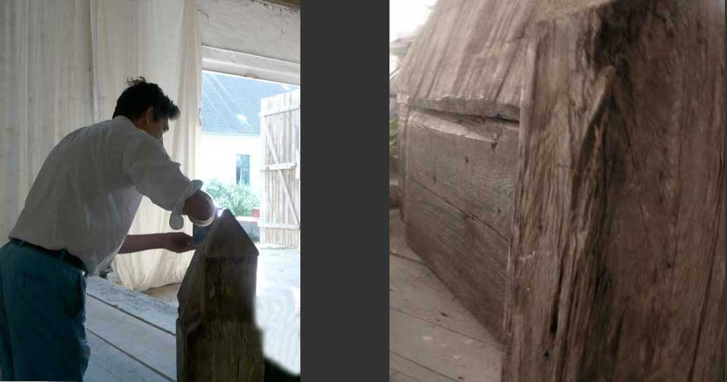 in Nossendorf 2006 die Pfeiler aus Holz, die das Haus und seine Umgebung markieren, zeichnen und das Modell aus Holz dazu in orig. Grösse.