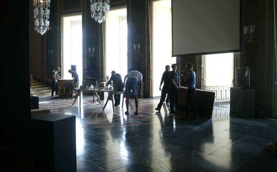 eingeladen nach Berlin ins Theater des Castorff als Volkstheater im Foyer mit dem Marmor aus der Reichskanzlei von Speer. Zum Tag der Einheit am 3. Oktober 2011, zu sehen was da los ist, auf dem Land, mit den Webcams der Wolken rundum, nun vom Turm.