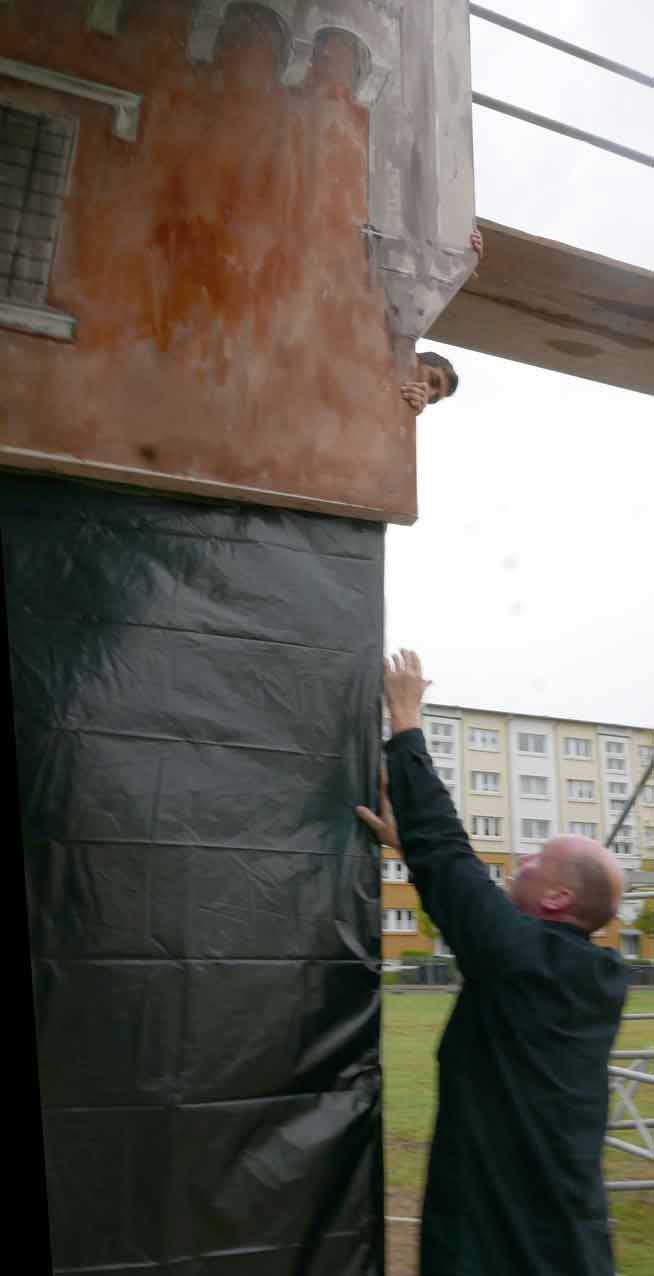 David baut das Esszimmer mit den Seiten innen gemalt wie aktuell zugemauert in N. und so das Kinderzimmer in den originalen Massen aus Latten und oben zu. In Paris wie in N. von unten die Erde rein. Vor der Öffnung des Hauses der Fenster und Türen, in Paris nachgebaut und live übertragen N nach Paris und P. nach Nossendorf.