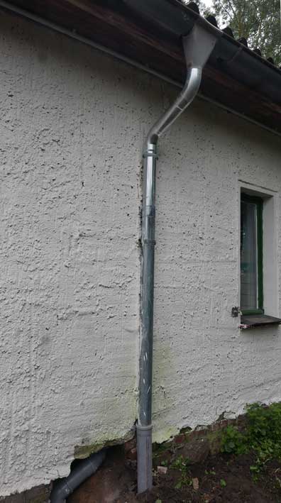 von unten die Rohre des Wasser hiun und ab und das des Regens weg vom Hausdach