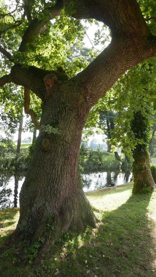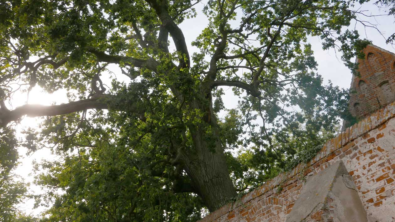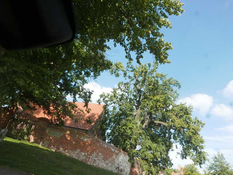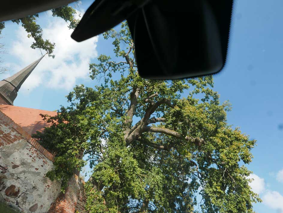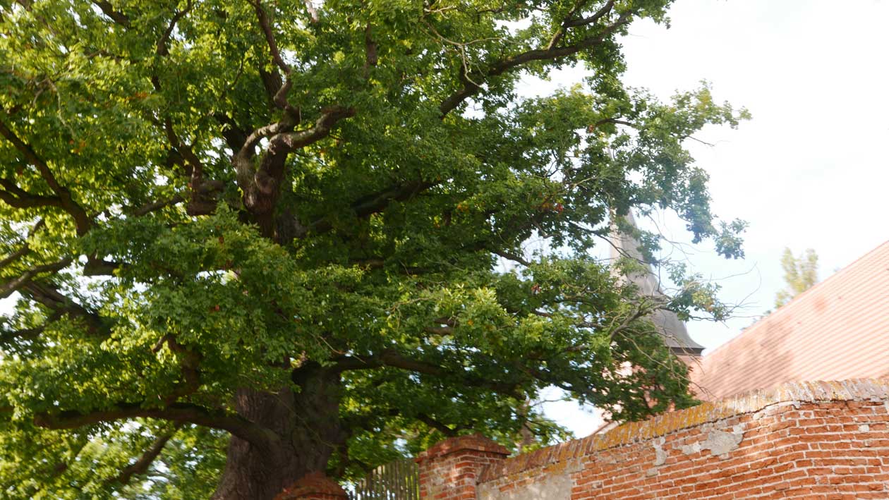Und wieder das schöne alte Dach der Kirche dazu und die alten Mauern mit den Eichen