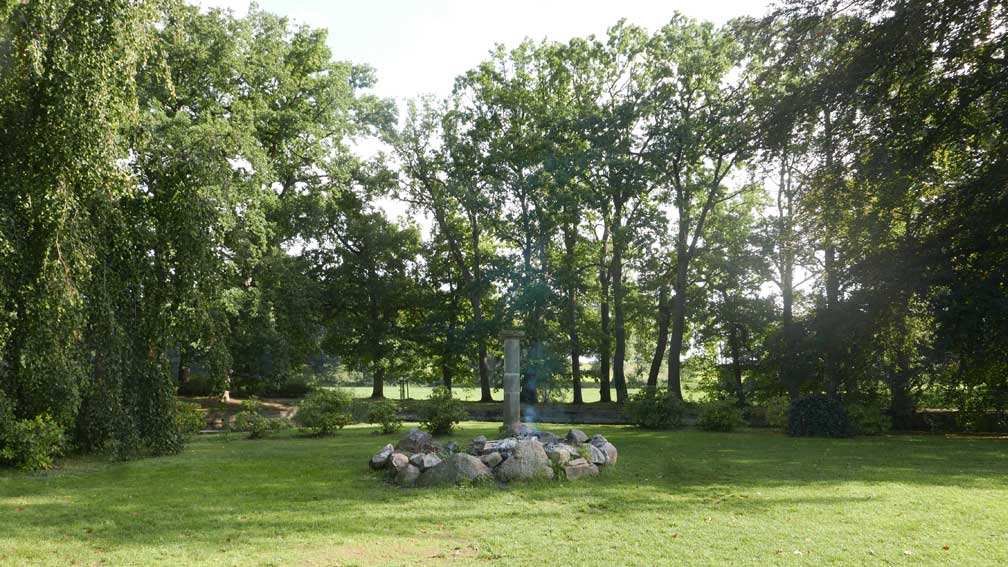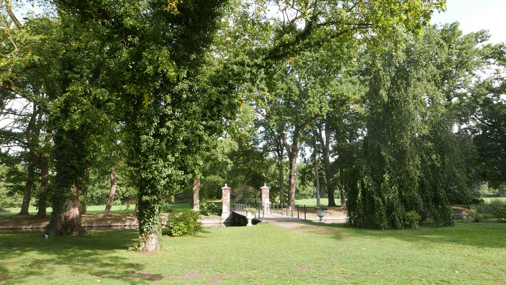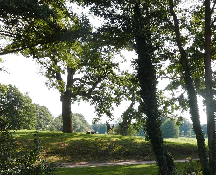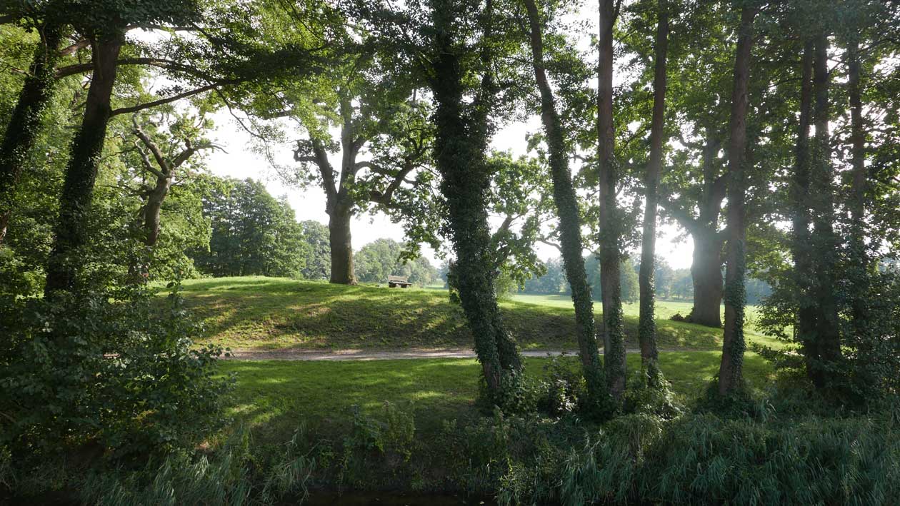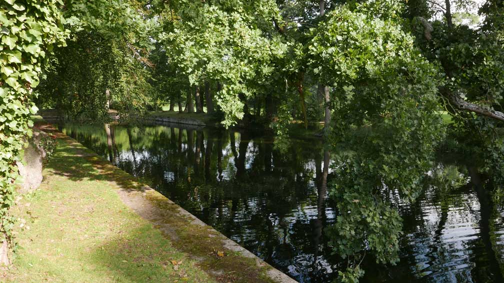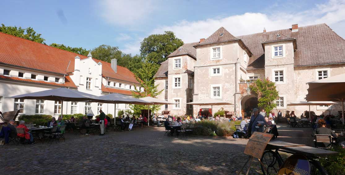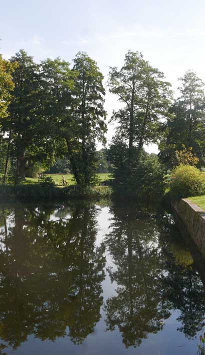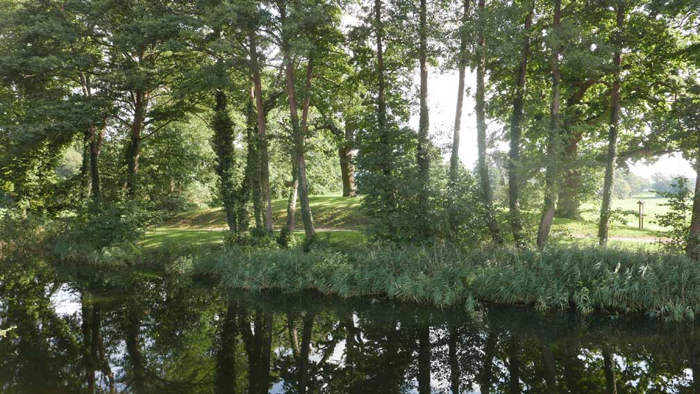 Mellentin, das vor-barocke Wasserschloss, in der Mitte der Insel.