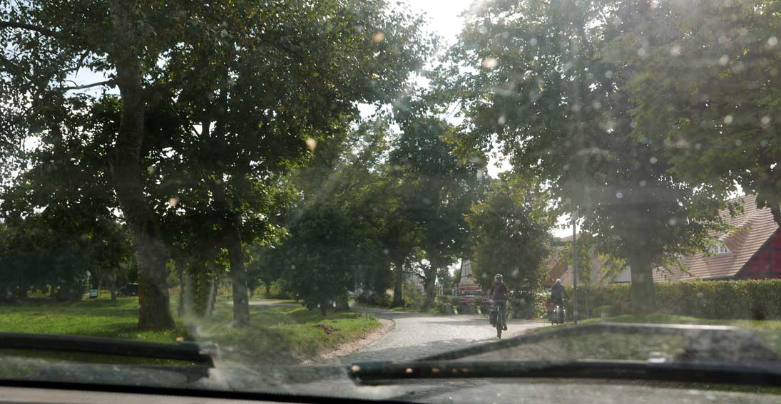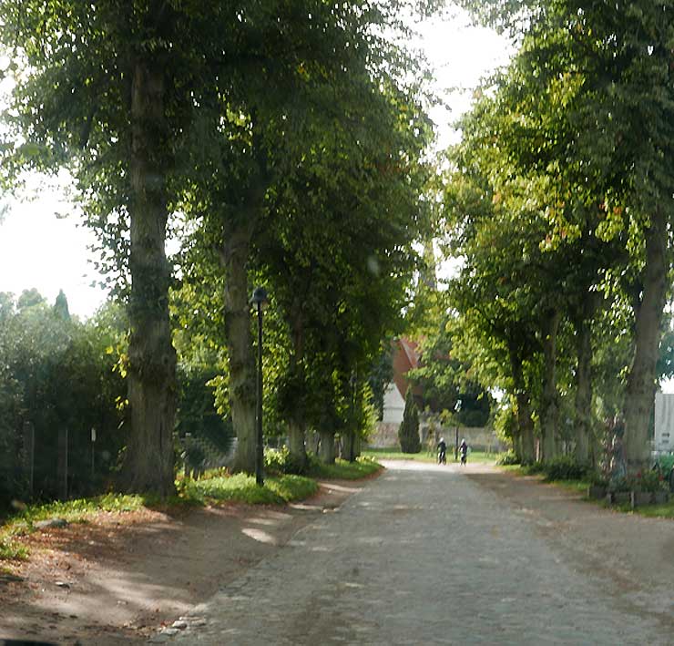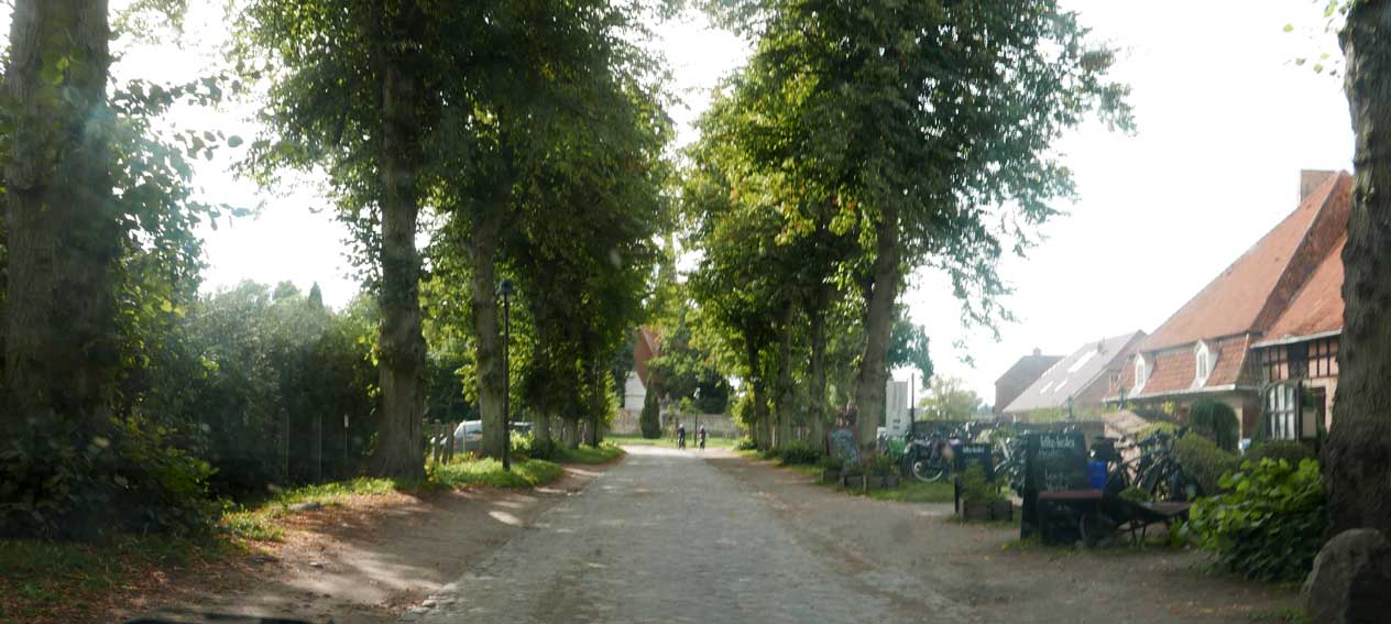 Die Dorfstrasse ist so wie sie von früher noch gekannt ist, an den Seiten ausgefranst für Fahrad und zu gehen, in der Mitte das Pflaster und darüber das Dach der Bäume. Und auch die Autos kommen durch.