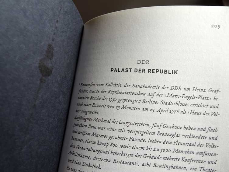 In dieser Beschreibung des verlorenen so genannten Palastes der DDR liest man vergebens die Namen der berühmten Erbauer des Schlosses davor und die unserer Geschichte von Kleist bis Menzel. Vielleicht ist das der eigentliche Verlust, solches nicht einmal noch zu wissen oder wissen zu wollen. Mit der nun neuen Öffnung des Hauses wieder tief eingegraben in unsere Angst nicht geliebt zu sein, in dem wir solches Erinnern. Auch das gehört zu diesem Jahr, das in offiziellen Rückblicken dies gar nicht mehr erwähnt, obwohl doch als grösstes Kulturereignis angekündigt.