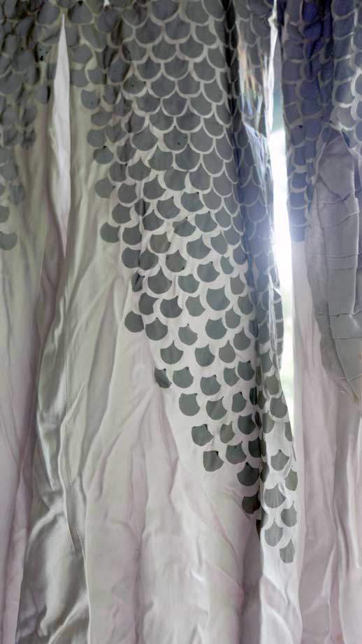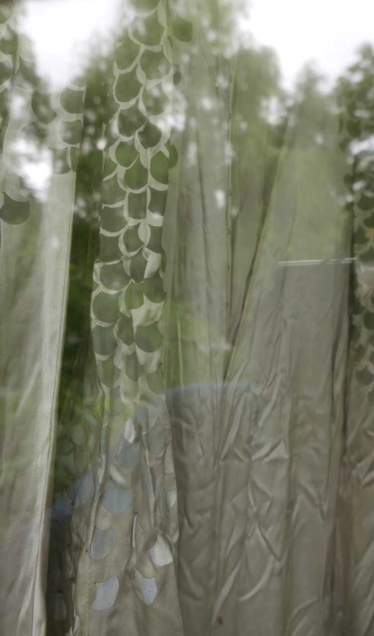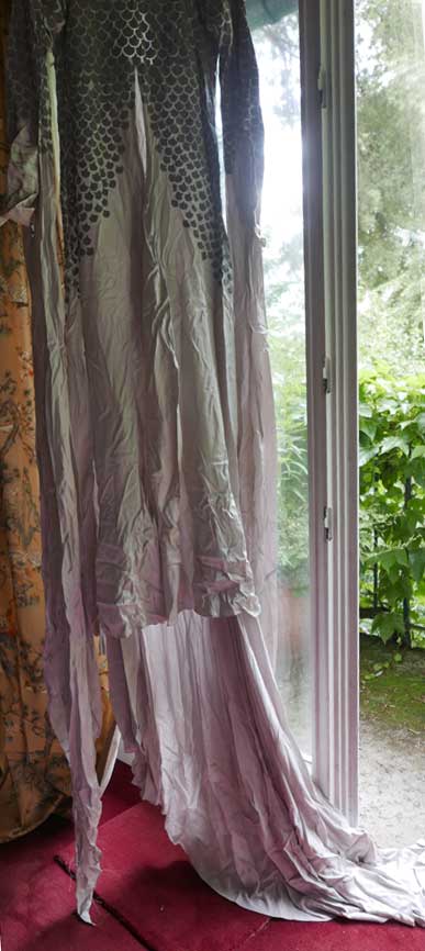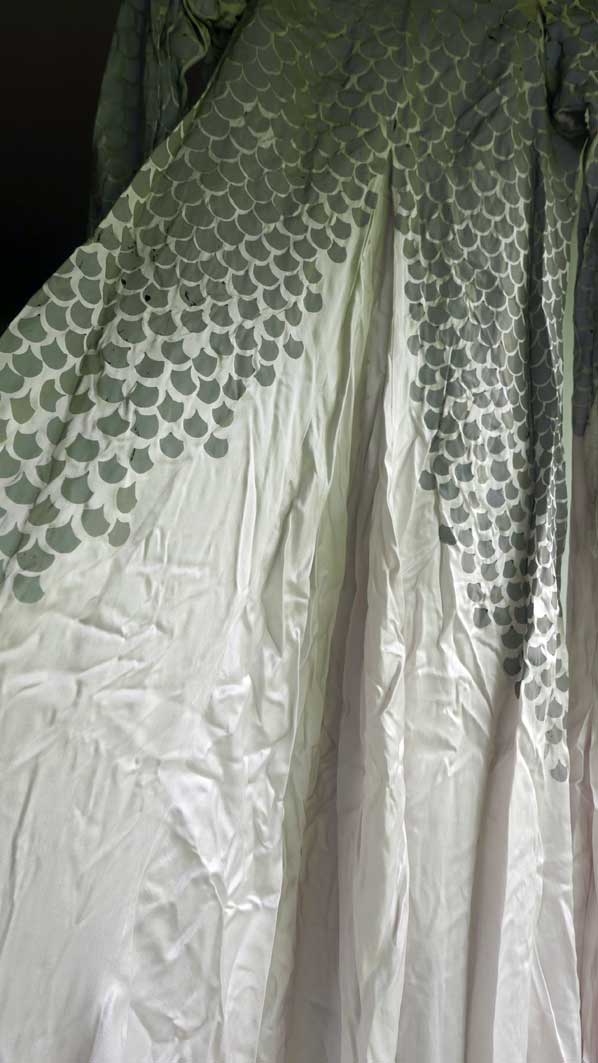 Aus dem Parsifal das Kostum der Gralsträgerin von Moidele Beickl aus der Schaubühne mit spiegelnden Pailetten, in denen sich der Gralstempel der Uraufführung RWs in Bayreuth spiegelte.