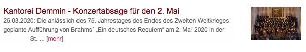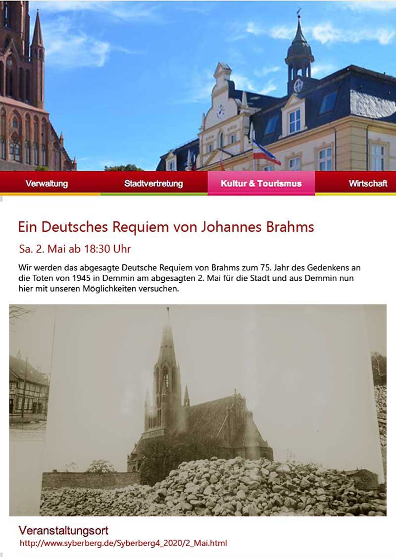 Anmerkungen zum Deutschen Requiem von Brahms im Internet, anstelle der geplanten Aufführung in Demmin am 2. Mai zum 75 Jahrestag des Kriegsende eben dort.