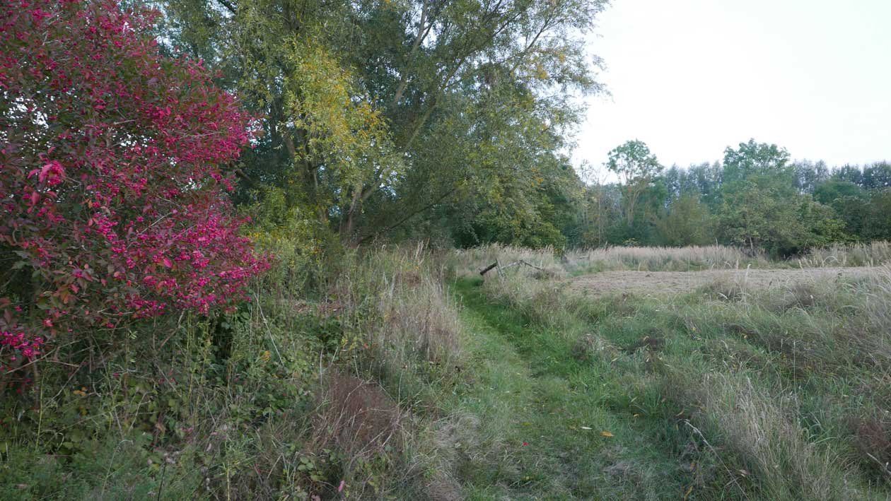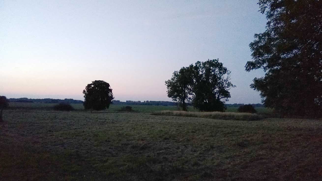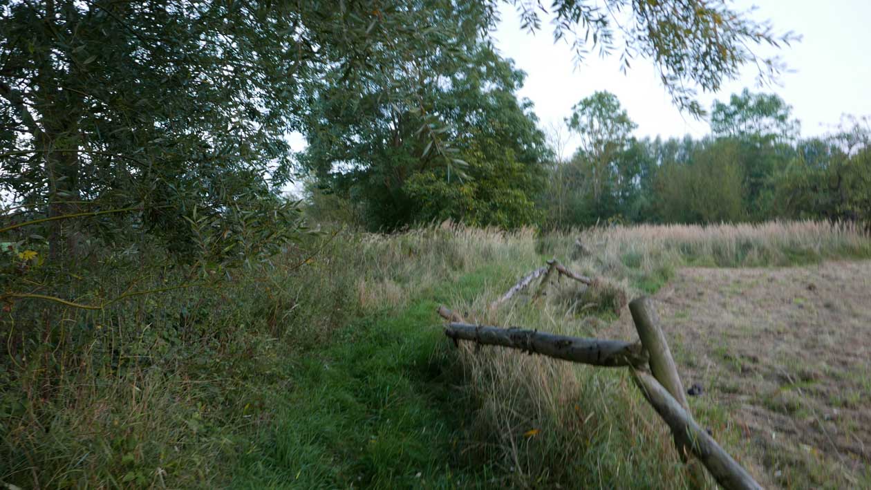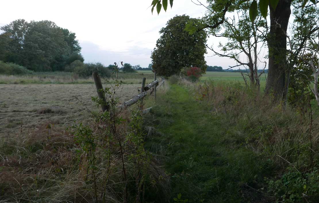 Die Koppel wieder und der Weg zur Brücke ins Feld. Die Zäune noch vom letzten Gebrauch der Schafe und Kühe wie ein Denkmal des Dorfs, das es einmal war.