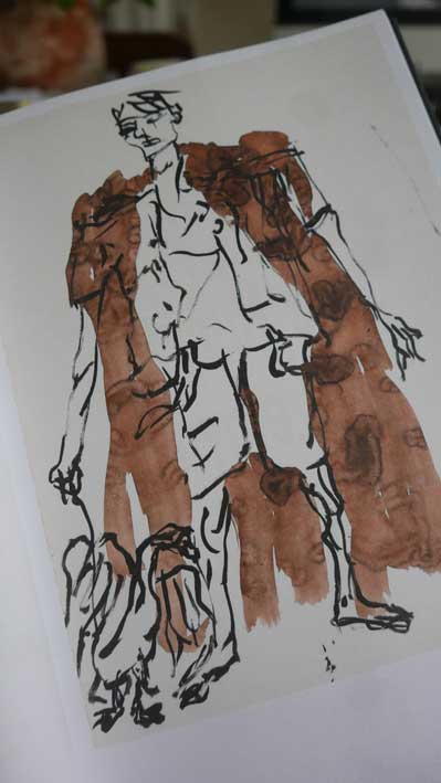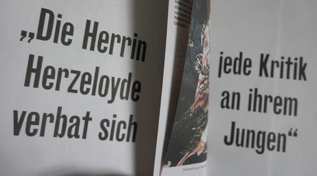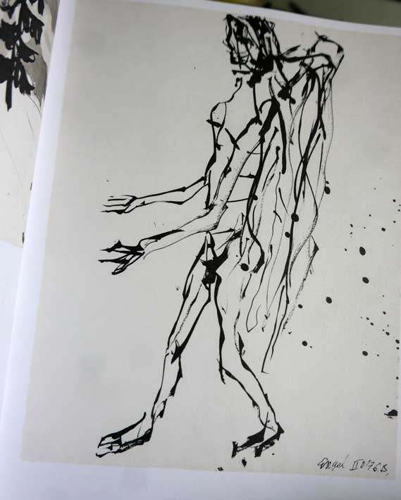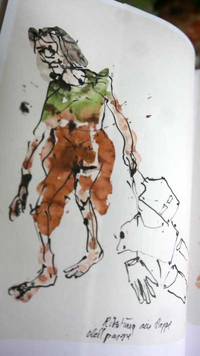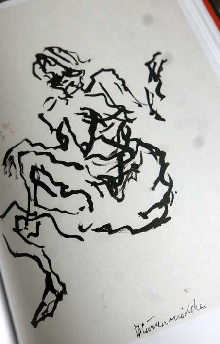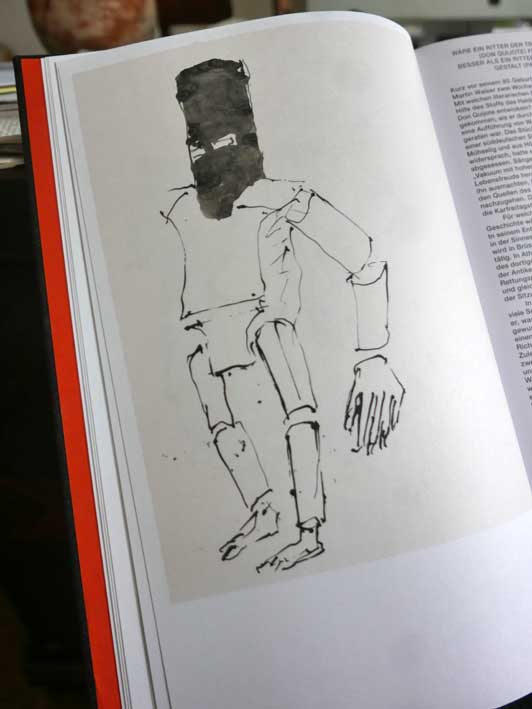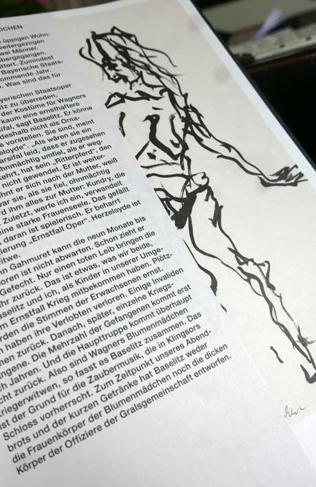 zu den Bildseiten Baselitz der Figuren und Bühnenbilder auf anderem Papier hineingeheftet parallel Textspalten