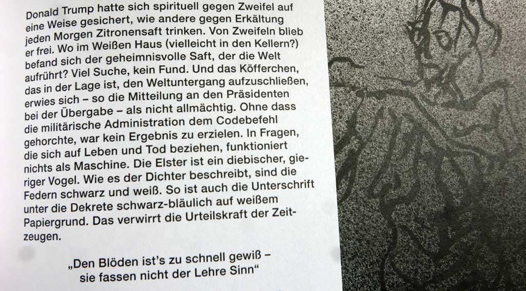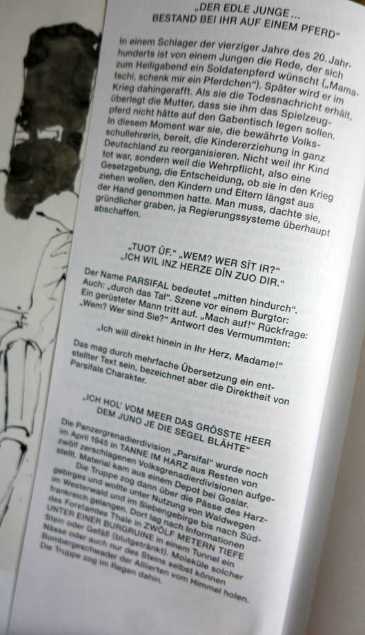 von Einar Schleef -Kluge sehr vertraut- gibt es einen zwangsweise abgebrochenen Parsifal mit Zeichnungen besonderer Art. Ihn auf diese Art doch noch erscheinen zu sehen wäre verdienstvoll. Wenn es zu dem Installationsraum in Demmin käme, zu realisieren im Raum.