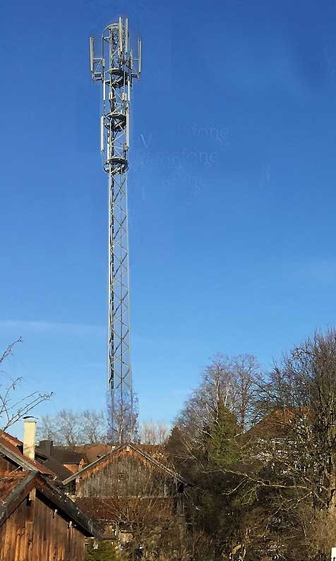 In Uffing, wo unser Freund D.Wieland, der vielgerühmte und gefürchtete Umwelt- und Heimat-Freund des BR wohnt, mit einsamen Blick auf die Berge endlich alles glücklich gerichtet aus dürftigem Zustand Haus und Garten, wird man nun vor sein Haus diesen Sendemast ins Fenster der Berge stellen. Von der Geimende begrüsst. Die Sucht nach der Ferne oder aus ihr bedient zu werden ist gross.