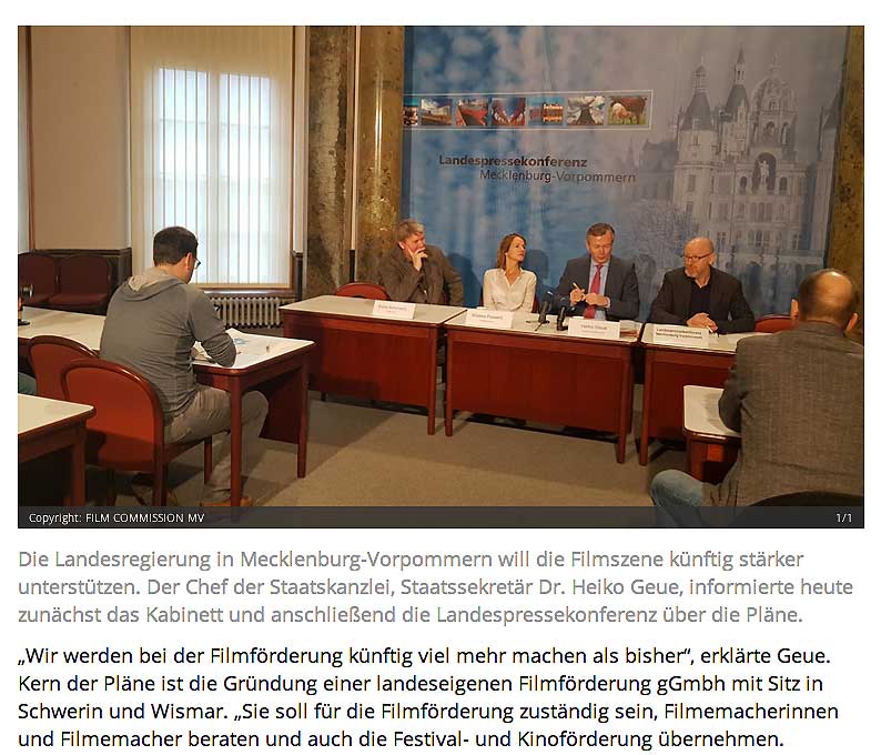 Damit bekommt Mecklenburg-Vorpommern eine Film- und Medienförderung, die auch kommerzielle Produktionen unterstützten kann. Bislang werden nur Filmprojekte mit einem betont kulturellen Anspruch mit rund 215 000 Euro jährlich vom Land gefördert. In der neuen Gesellschaft sollen die Filmproduktions-, Festival- und Kinoförderung sowie die Tätigkeit der Film Commission MV gebündelt werden. Letztere unterstützt Produktionen etwa bei der Suche nach Drehorten.
