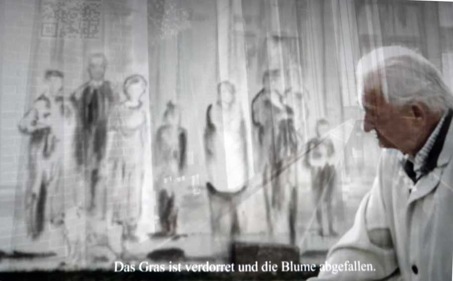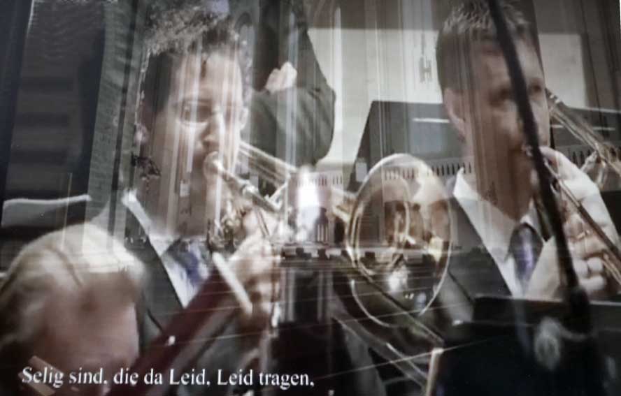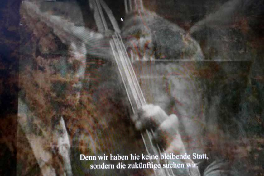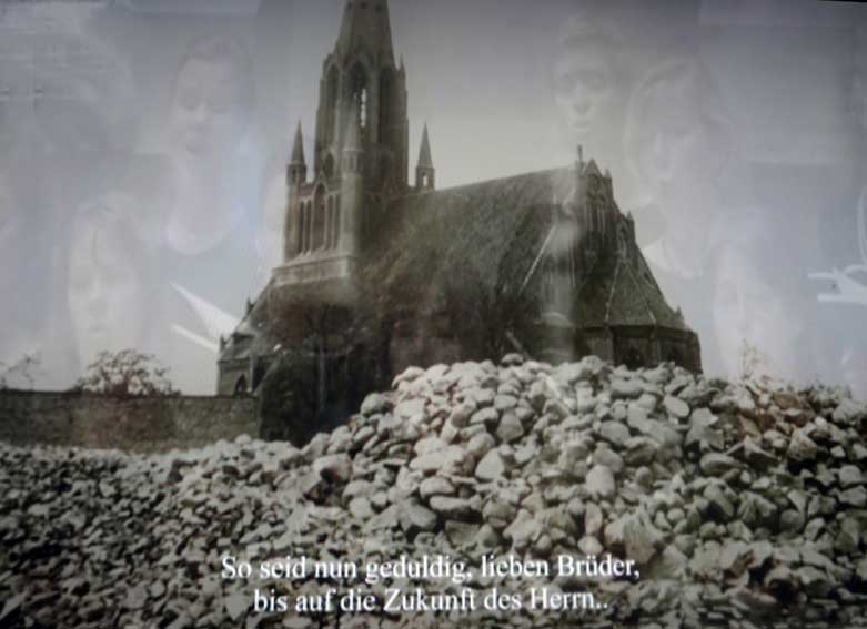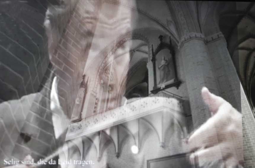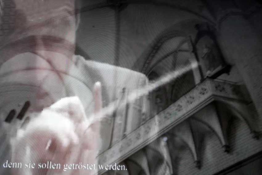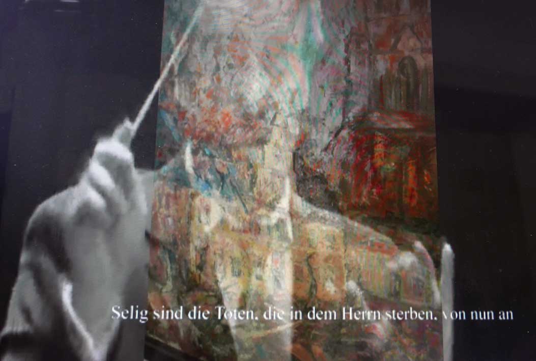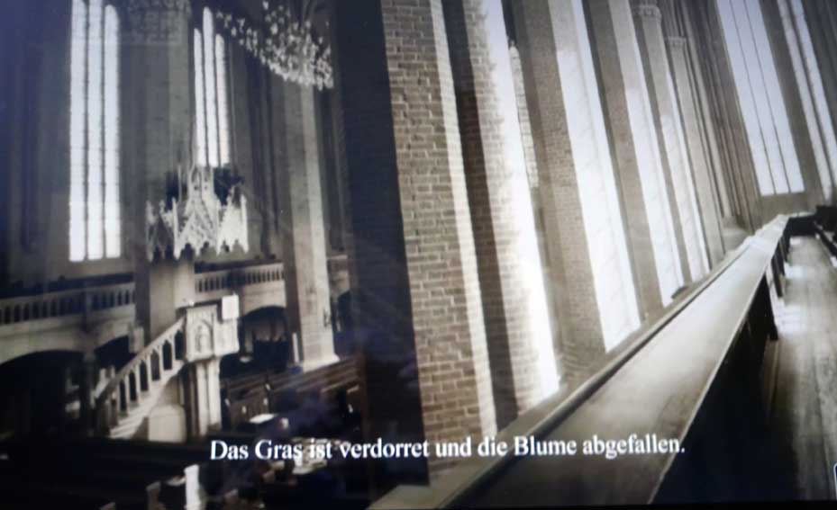 Was in zwei Tagen gemacht ist, mit Sammeln davor und Korrekturen danach, besteht aus zwei Hauptströmen. Die Aufnahme des Requiems mit Ton(V.Gergiev) in der vollen Länge und der Gang durch St. Bartholomaie in Demmin (45Min) zur Orgel während der 1 stündigen Öffnung der Kirche am Gründonnerstag vor Ostern(an der Orgel Th. Beck mit J.S. Bach ohne Ton hier 45 Min). Die beiden optischen Ströme durchwachsen sich und da im Kommen und Gehen der Durchblendungen. Dazu und hinein die Bilder vom Markt der letzten Jahre in Demmin und die Totenbilder der Häuser des brennenden Demmin von 1945 von K. Schlösser. Alles zusammen aus und in N. montiert.