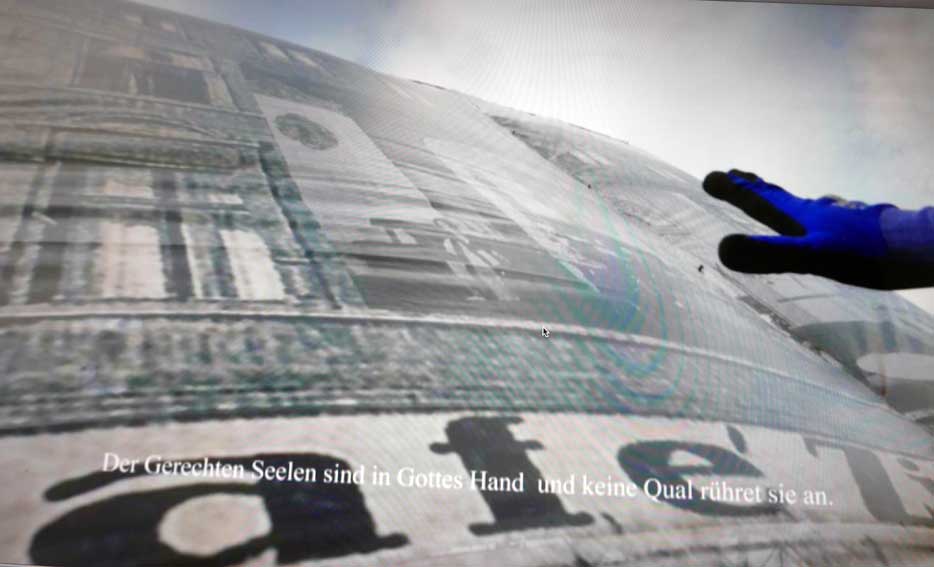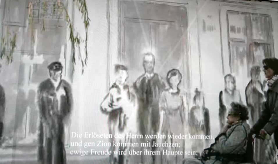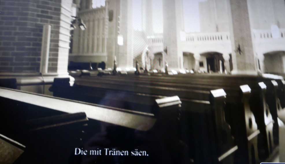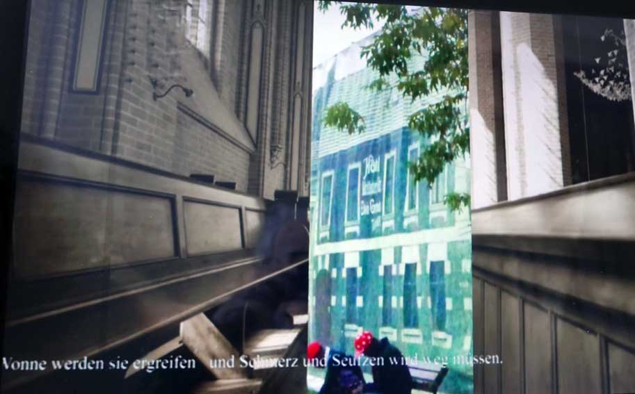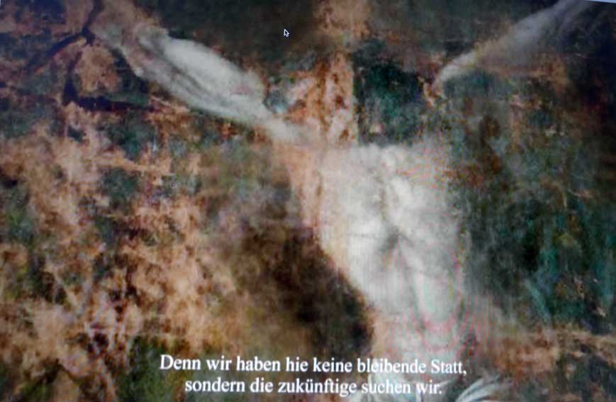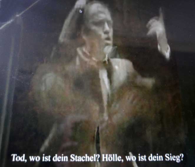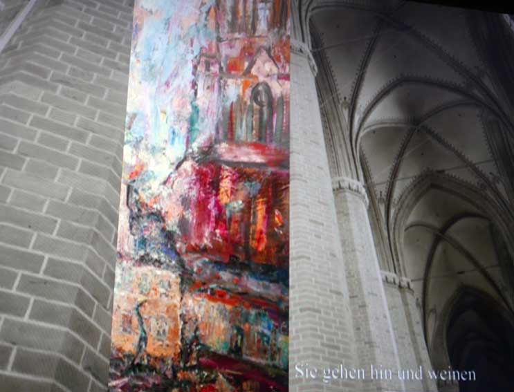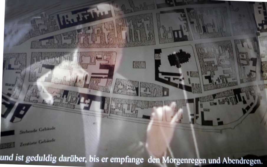 Was in zwei Tagen gemacht ist, mit Sammeln davor und Korrekturen danach, besteht aus zwei Hauptströmen. Die Aufnahme des Requiems mit Ton(V.Gergiev) in der vollen Länge und der Gang durch St. Bartholomaie in Demmin (45Min) zur Orgel während der 1 stündigen Öffnung der Kirche am Gründonnerstag vor Ostern(an der Orgel Th. Beck mit J.S. Bach ohne Ton hier 45 Min). Die beiden optischen Ströme durchwachsen sich und da im Kommen und Gehen der Durchblendungen. Dazu und hinein die Bilder vom Markt der letzten Jahre in Demmin und die Totenbilder der Häuser des brennenden Demmin von 1945 von K. Schlösser. Alles zusammen aus und in N. montiert.