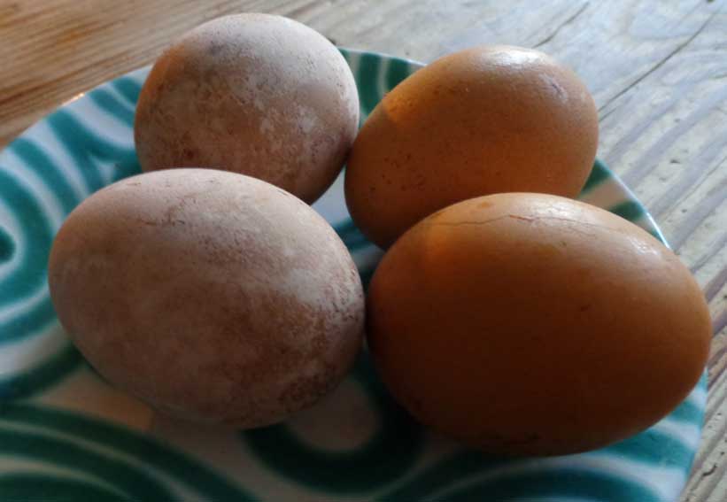 Am Abend der Versuch die Eier zu färben. Das eine mit Kuruma gelb und das andere mit Brennesseln, den jungen, grün gemeint.