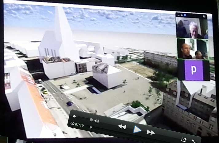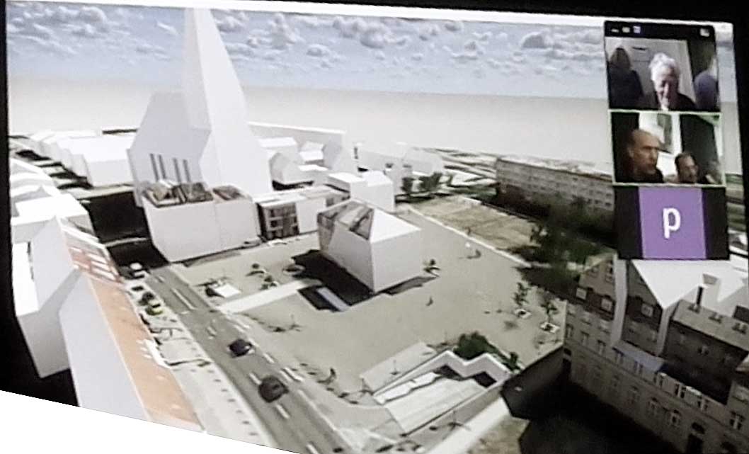 So beginnt die Studie desArchitekturbüros von P. Haimerl aus München, die die Machbarkeit prüfen soll. Es wäre unfair deren Veröffentlichung vor seiner Präsentation im Rathaus hier vorweg zunehmen. Den Termin können wir nun gerne vorschlagen, wir die den Auftrag an Haimerl ausgaben. Warum gerade wir und das nach dem Anlauf mit den Stuttgarter Studenten unter Leitung von Prof. A. Schwarz aus dem Büro Chipperfield in Berlin vor einem Jahr. Wir, das sind die Freunde aus Nossendorf als Verein und aus der Kenntnis zum Teil noch des Brandes und der Situation von 1945 als das alles zusammenfiel. Haimerl sprach auch darüber zu seiner Arbeit, warum und wie er sich das also heute so darstellt, und wie er eine aktuelle Lösung sieht.