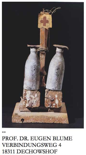 als voršsterlichen Gruss die Kreuzigung von Joseph Beuys. Mir scheint dieses gewandelte Bild unserem gegenwärtigen Zustand zu entsprechen: eine Nadel pendelt zwischen ausgedienten Blutkonserven. Das Gleichgewicht verloren.
